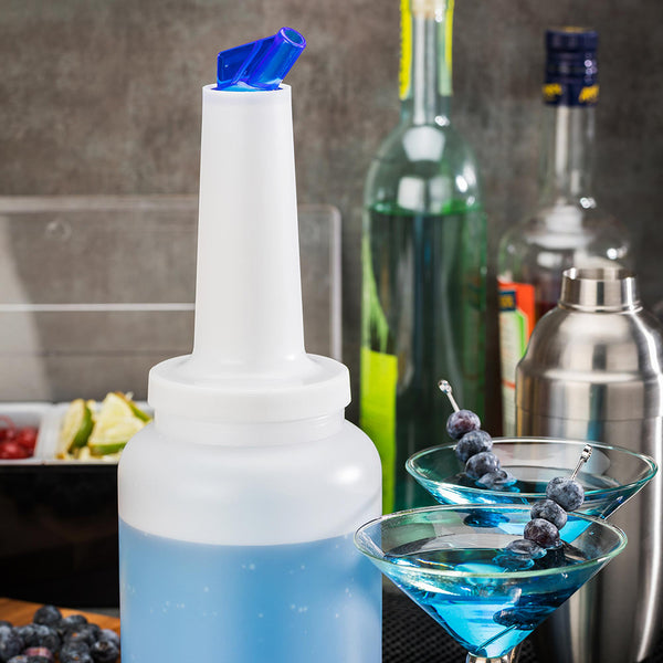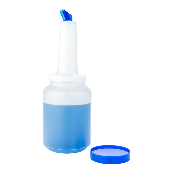 Keep your prepared cocktail mixes, freshly squeezed juices, and flavored syrups organized and easily accessible with this Bar Lux Quick Pour Storage Container Bottle. Equipped with an interchangeable dispensing lid and a twist-on storage lid, the two-in-one design of this innovative juice pour bottle makes it simple to transition between storing and pouring your prepared ingredients. The color-coded storage lid creates an airtight seal to keep ingredients fresh and ready-for-use, while the dispensing lid features an easy-to-grip neck and vented pour spout to ensure consistent and precise pouring. In addition, the blue storage lid can also be utilized as a color-coded base for easy organization and quick identification. Manufactured from premium plastic, this quick pour storage container is dishwasher safe for quick and sanitary cleaning after use. Ideal for use as a juice container or salad bar dressing storage container, this quick pour bottle is a must-have for bars, restaurants, and other foodservice establishments. This 2-quart storage container with pour spout and lids is sold in a 1 count box.