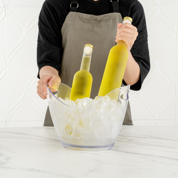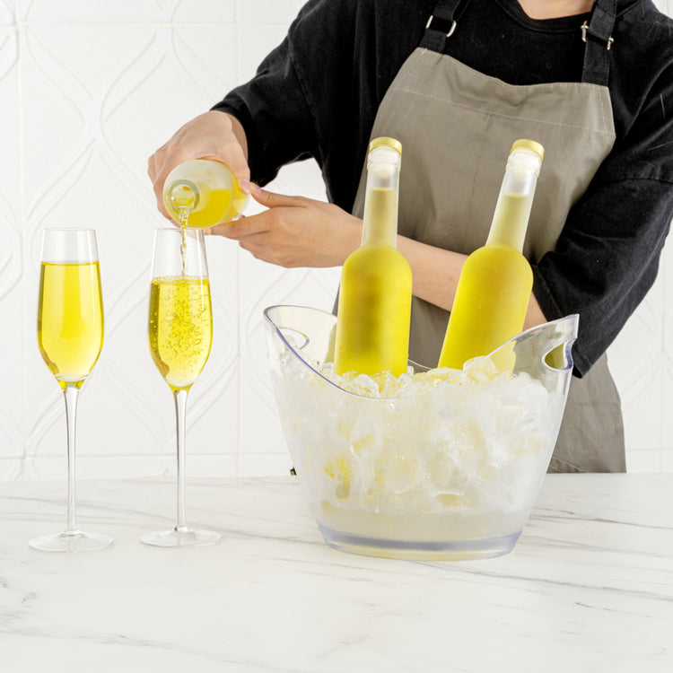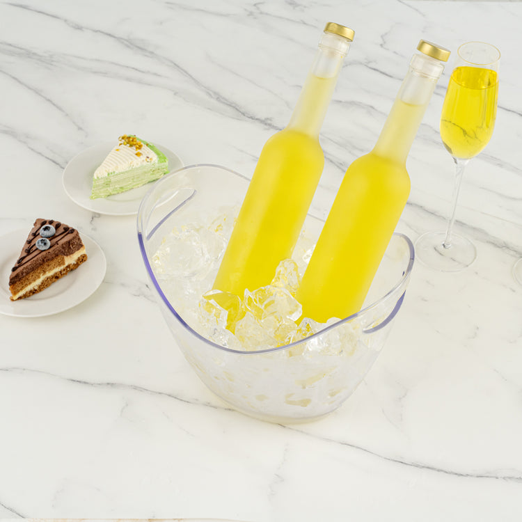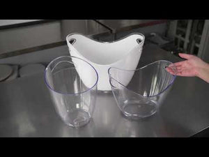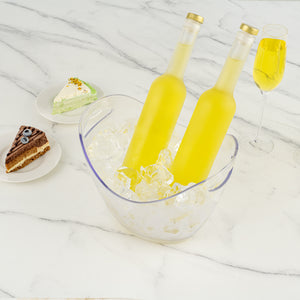 Create elegant beverage presentations for guests using our Bar Lux 3.7-quart Oval Clear Plastic Champagne Wine Buckets. Designed with stylish curves and an oval shape, these champagne ice buckets instantly upgrade the look of chilled wine bottles. The clear finish of these beer ice buckets expertly shows off your drinks. Crafted with high-quality plastic, these wine cooler buckets are break-resistant to avoid messes and perfect for filling with ice and chilled bottles. The built-in handles of these wine buckets provide an easy and comfortable way for servers to carry beverages to your customers' tables. Perfect for avoiding spills, the base of these wine cooler buckets provides superior stability on all kinds of surfaces. Measuring 10.6 inches in length by 8 inches in width and 7.8 inches in height, these beverage buckets hold up to 3.7 quarts. Sold in a 10 count box.