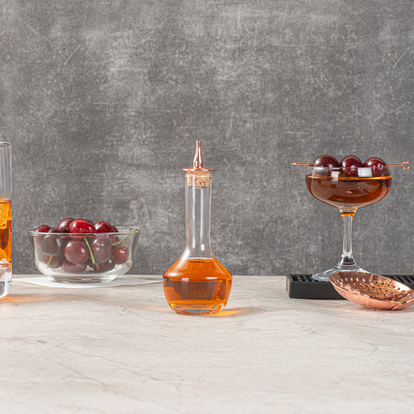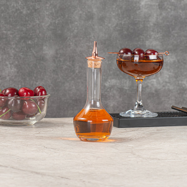 The secret to making signature handcrafted cocktails? A little dash of this, and a little dash of that! These Bar Lux Glass Bitters Bottles feature stylish copper-plated dashers that are designed to help you dash your way to the perfect Old Fashioned, Sazerac, or Manhattan. These dashers are built to carefully and evenly dispense liquids to ensure that your cocktails are deliciously balanced and consistent. Inspired by antique bitters bottles, these 3.5-ounce glass bottles feature a rounded base with an easy-to-grip tapered neck. Ideal for use as bitters containers behind the bar, or as oil and vinegar or hot sauce containers in the kitchen. These 3.5-ounce Bar Lux Glass Bitters Bottles with Copper-Plated Dashers are shipped in a 1 count box.