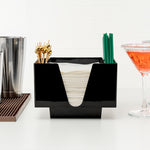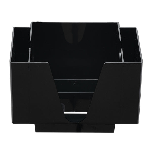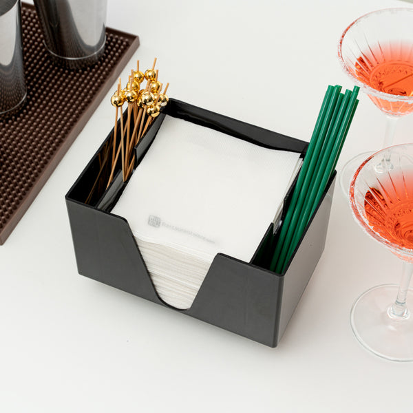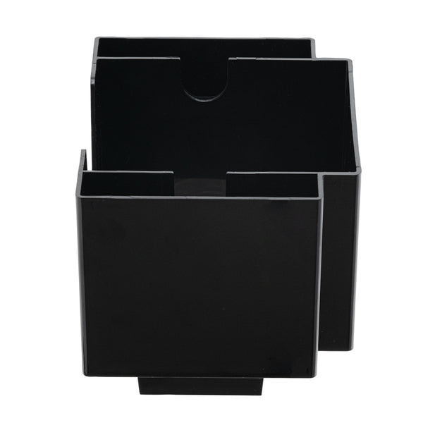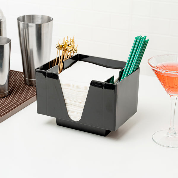 Provide guests with utensils, condiments, and napkins all in one place using our Bar Lux Rectangle Black Plastic Condiment Caddy / Napkin Holder. Equipped with 3 individual compartments, this condiment caddy is meant for multipurpose use at your restaurant, hotel, or catered events. The stylish black finish brings a sleek and simple look to tabletops at your establishment. Designed with a built-in napkin holder at the center, this napkin caddy provides guests with convenient access to napkins. The 2 compartments on the sides of this dispenser can easily hold forks, knives, straws, or condiments. Great for avoiding accidents, the sturdy base of this napkin holder provides superior stability on all surfaces. This condiment caddy is constructed with high-quality plastic and is strong and sturdy to withstand daily use at your restaurant. This napkin caddy measures 7.9 inches in length by 5.5 inches in width and 5.7 inches in height. Shipped in a 1 count box.