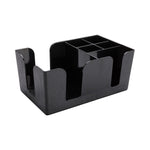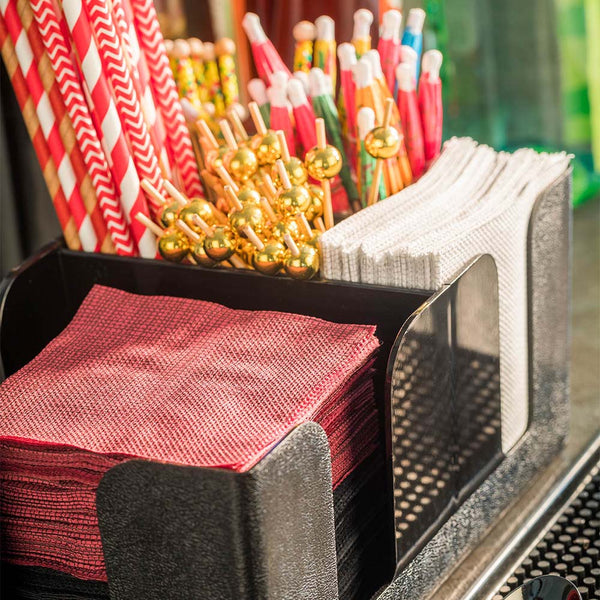 Keep condiments, napkins, and utensils organized with the Bar Lux Black Plastic Condiment Caddy Napkin Holder. Made from high-quality plastic, this black condiment caddy is designed with two spacious slots to hold standard napkins and cocktail napkins for quick dispensing. The four smaller compartments of this tabletop caddy neatly store straws, skewers, stirrers, or utensils to have everything in one place. This plastic caddy has a compact design and is ideal for maximizing limited counter space in any bar or restaurant. With six compartments, this storage caddy keeps items separated and prevents cross-contamination for health code compliance. The sleek black finish and pebbled texture of this bar caddy complement any decor while hiding smudges and stains from frequent use. This napkin holder measures 9.5 inches long by 5.75 inches wide by 4.25 inches tall. Sold in a 1 count box.
