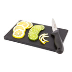 Prevent kitchen accidents with a reliable non-slip cutting surface. The Bar Lux Black Plastic Chopping Board features non-slip grips that ensure stability on wet countertops, providing a safe environment during food preparation. This compact plastic chopping board, measuring 5.9 inches in length by 9.8 inches in width, is perfect for small prep areas, enhancing efficiency in bustling foodservice settings. Equipped with measurement markers in centimeters and inches, it facilitates precise cutting, allowing chefs to maintain consistency in portion sizes. The sleek black color of this non-slip cutting board complements any professional kitchen decor, while the built-in handle offers portability and convenient storage, optimizing your kitchen space. Ideal for preparing garnishes and fruit wedges, this cutting board with handle is suitable for bars, small kitchens, and catering events, streamlining your workflow. Each order includes 1 Bar Lux Black Plastic Chopping Board.