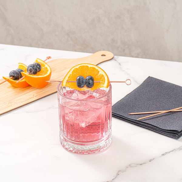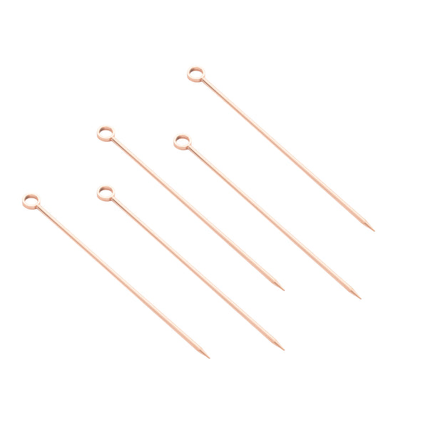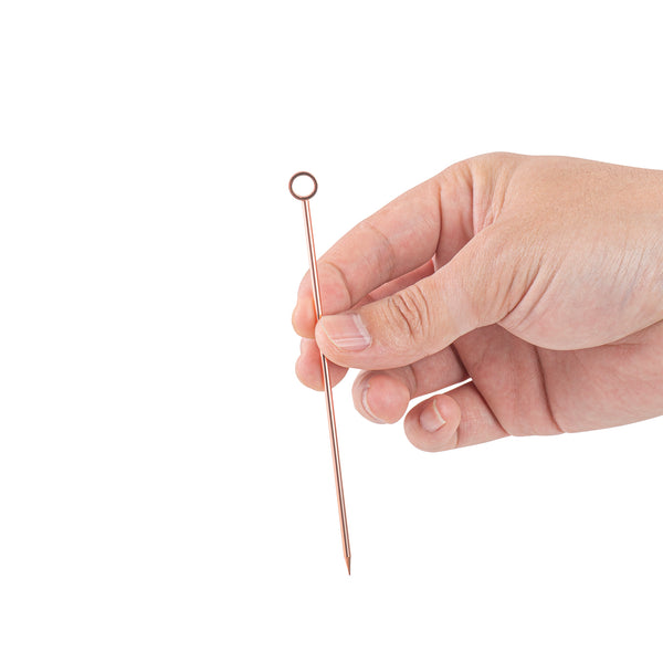 Give your garnishes a new look with our Bar Lux Copper Stainless Steel Cocktail Picks. Featuring a circular handle, these olive picks enhance your cocktails presentations and instantly draw customers' eyes to your beverages. Designed with a copper-plated finish, these martini olive skewers give your drinks a sophisticated look. The sharp point of these cocktail skewers effortlessly pierce through citrus wedges and other garnishes to streamline your drink preparations at your bar or restaurant. Crafted from stainless steel, these copper cocktail picks are corrosion-resistant to keep their high-grade appearance for long-lasting use. To preserve the copper plating, we recommend handwashing only. These martini skewers measure 4.5 inches long. Sold in a 10 count box.