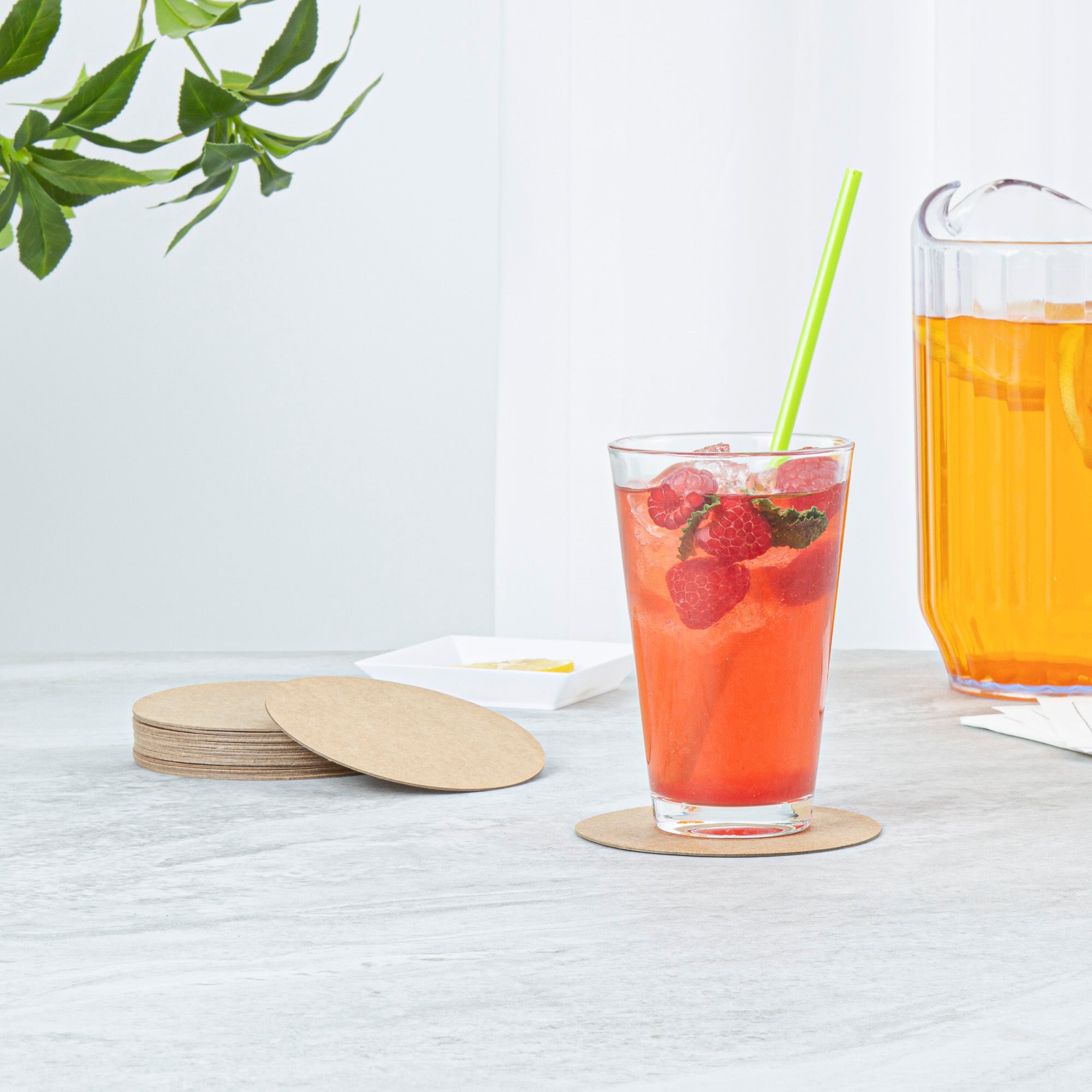 Enhance your beverage presentation with versatile, absorbent protection. Bar Lux Round Drink Coasters are crafted from premium kraft paper, providing a sturdy surface that effectively shields tables from condensation. Ideal for a variety of glassware, their four-inch round design ensures adaptability across diverse drink offerings, making them perfect for high-traffic bars and restaurants. These coasters feature a high-density water-absorbent board that dries faster, reducing downtime and maintaining a clean service area. With the added benefit of a reusable design, these coasters help lower costs for venues with high turnover by allowing for multiple uses after air-drying. Full-color printing capabilities enable custom shape coasters, enhancing brand visibility and creating a lasting impression. Their natural kraft color adds a rustic aesthetic to any setting, complementing a variety of decor themes. Simplify your cleanup processes and support eco-friendly practices with these recyclable pulpboard coasters. Each order includes 1000 Bar Lux Round Drink Coasters.