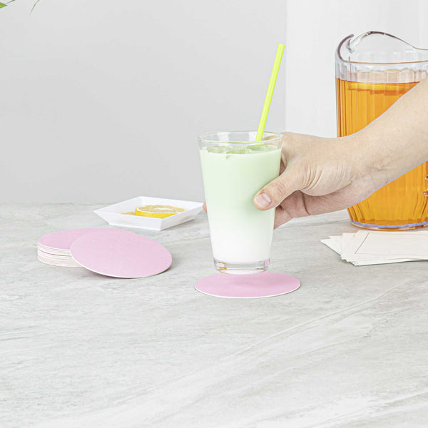 Enhance beverage service with versatile, absorbent drink coasters. Bar Lux High-Density Absorbency Drink Coaster features a 4-inch round design that accommodates various glass sizes, offering flexibility for all types of drinkware. Made from a high-density absorbent board, this paper coaster speeds up condensation cleanup and minimizes mess, making it an ideal table protector during busy shifts. Its reusable design helps reduce waste and replacement costs, while the ability to print in full color supports custom branding to elevate your establishment’s identity. The vibrant pink color adds a lively touch to any setting, enhancing the aesthetic appeal of your beverage presentations. Whether shielding surfaces at bustling bars or adding flair to catered events, these coasters provide a practical and stylish solution. Ensure your tables and counters stay protected with these indispensable coasters. Each order includes 100 Bar Lux High-Density Absorbency Drink Coaster.