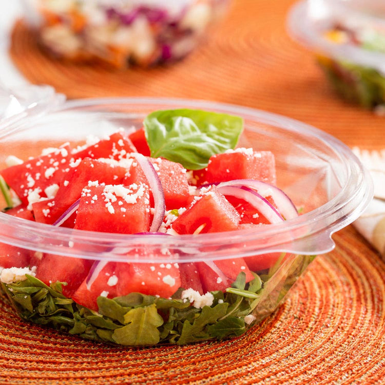 Elevate your delivery service offerings with the Basic Nature 24-Ounce Clear PLA Plastic To Go Bowls. Created from PLA, a sustainable plant-derived plastic, these to go bowls offer a great alternative to common packaging solutions. These clear 24-ounce takeaway bowls are ideal for serving substantial portions of salads, pasta dishes, or stir-fries. Designed exclusively for cold food items, these disposable salad bowls are adaptable to a variety of meals. To secure your food items during delivery, these plastic bowls for food can be paired with our Basic Nature lid (SKU: RWP0173C). Each of these commercially compostable plastic bowls measures 7 inches in diameter by 2.25 inches in height, providing ample space for generous meal portions. Sold in a 500 count box. Lids are available and sold separately. NOTE: Store and use under 105F. Avoid prolonged exposure to direct sunlight. Suitable for cold food items only.