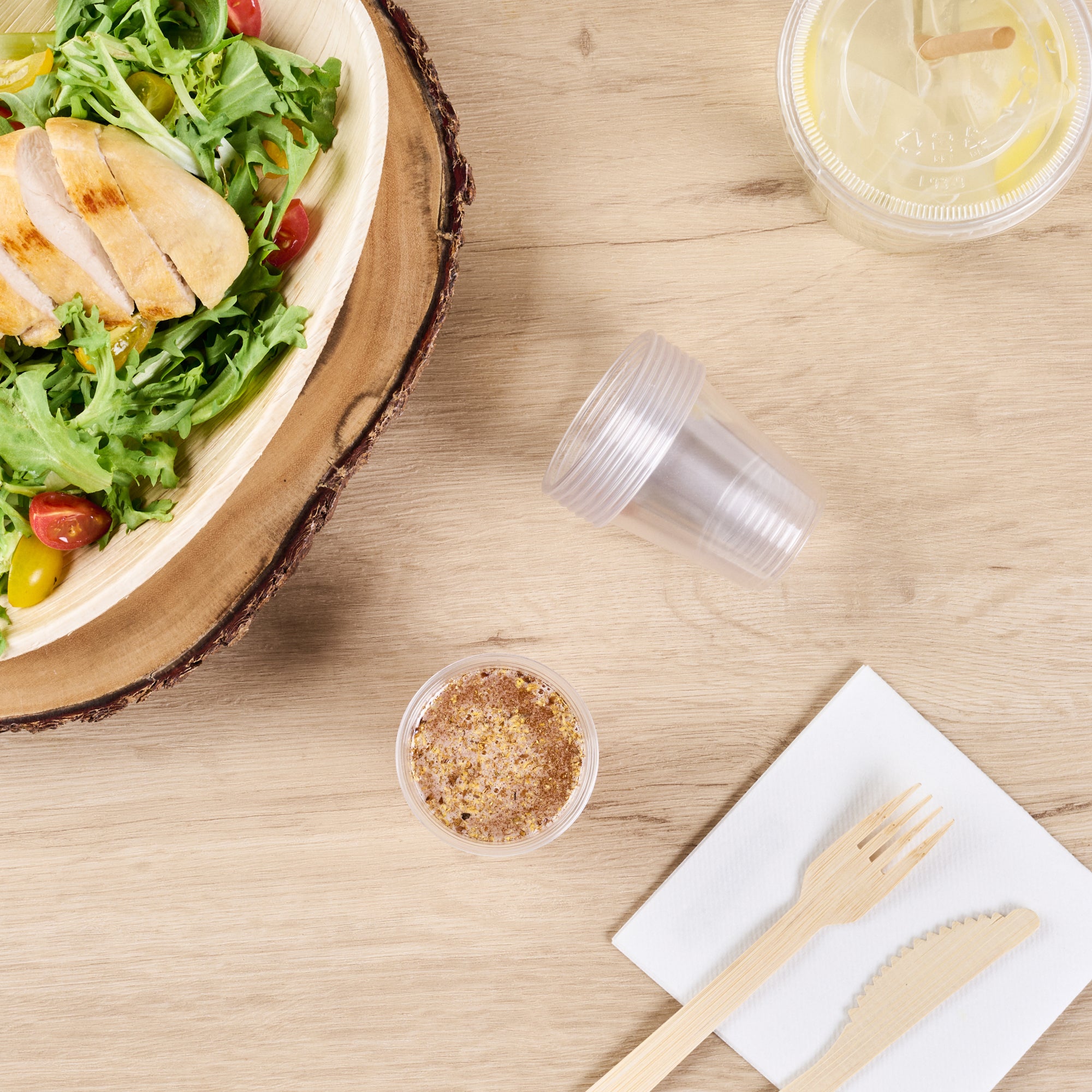 Enhance sustainability efforts. The Basic Nature Compostable 3 oz Portion Cup is designed with crystal-clear transparency, measuring 2.4 inches by 2.4 inches by 2.2 inches, to showcase sauces and dressings in an appealing way. These compostable portion cups are made from renewable resources and align with global sustainability goals. Perfect for cold food applications, this BPA-free, greaseproof plastic sauce cup is ideal for serving condiments without the risk of leakage. With its freezer-safe feature, it supports efficient pre-portioned meal prep, enabling foodservice establishments to manage inventory effectively while maintaining freshness. Elevate your food presentation and meet eco-regulations seamlessly with these biodegradable, PFAS-free portion cups. Each order includes 2000 Basic Nature Compostable 3 oz Portion Cups.