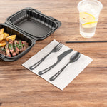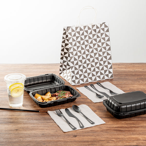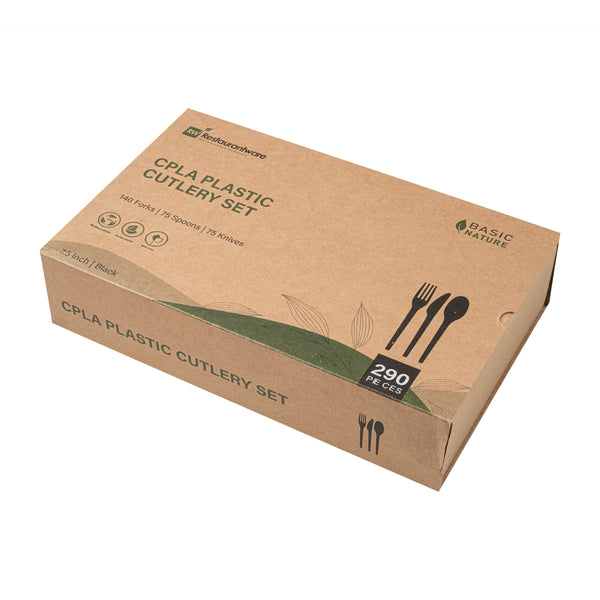 Enjoy versatility and sustainability with our disposable cutlery set. The Basic Nature Black Plastic Disposable Cutlery Set offers reinforced handles, ensuring you can scoop hefty bites without worry of breakage, making it perfect for catering events or take out services. Crafted from premium CPLA plastic, this black cutlery set is heat-resistant up to 180 degrees Fahrenheit, allowing seamless service of both hot and cold dishes. Each piece is commercially compostable, reducing your operation's carbon footprint while providing hygienic protection. Measuring 7.5 inches in length, this set is designed to fit various foodservice needs. The striking black finish enhances the presentation of light-colored table settings, adding a sophisticated touch. Support your sustainability initiatives with this compostable flatware that balances eco-friendly practices with quality. Each order includes 290 Basic Nature Black Plastic Disposable Cutlery Sets.