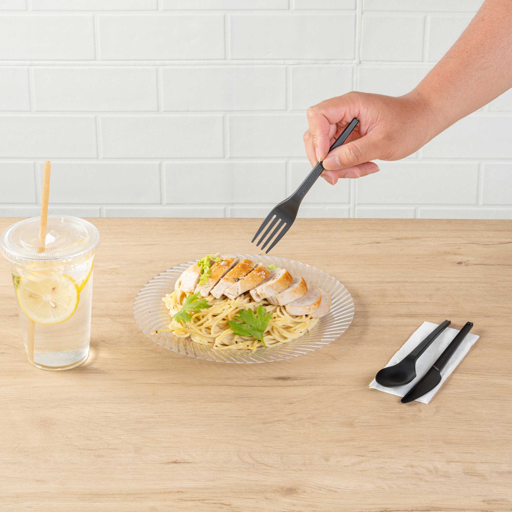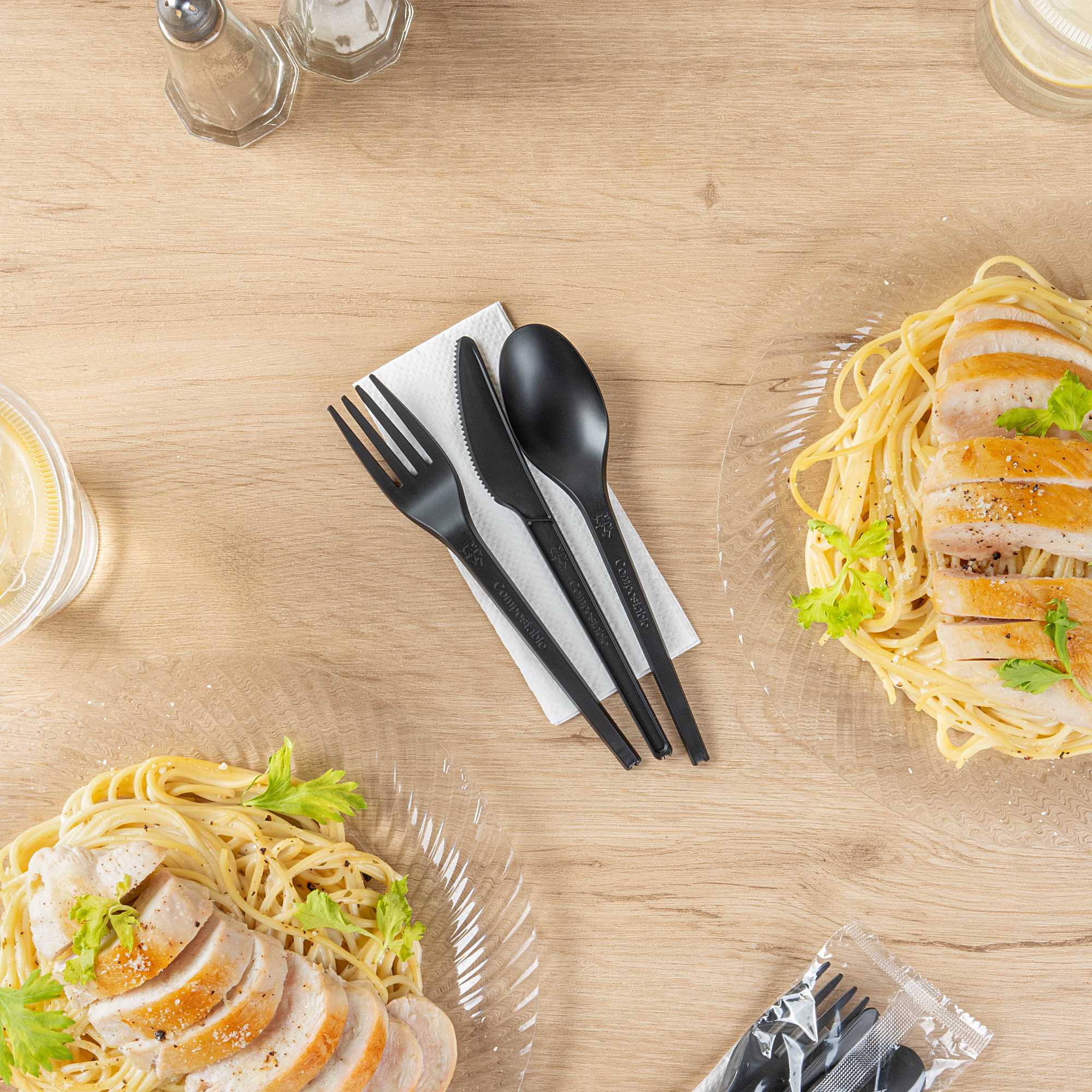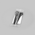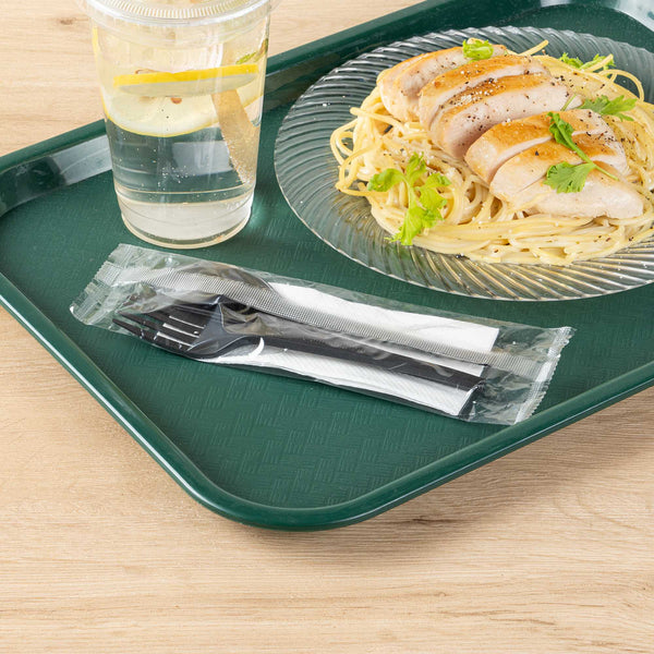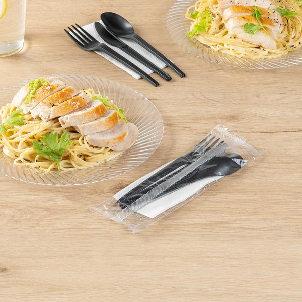 BLACK CPLA PLASTIC CUTLERY SET - WHITE NAPKIN, HEAT-RESISTANT