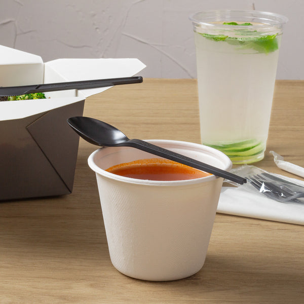 Enjoy your favorite snacks in an eco-friendly way with our Basic Nature Black CPLA Plastic Spoons. These BPI Certified spoons are made from CPLA plastic, a bioplastic derived from cornstarch, which is commercially compostable to reduce your carbon footprint. Wrapped in a clear, plastic bag, these biodegradable spoons stay clean, making them perfect for take out orders. Great for pairing with hot chili, these individually wrapped spoons are heat-resistant. With a black finish, these plastic spoons match perfectly with your restaurant's take out packaging. These black spoons measure 6.5 inches long. Sold in a 50 count box. This item will only degrade outside of the traditional solid waste stream.