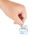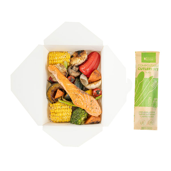 Ensure sanitary dining with our wrapped plastic cutlery set. The Basic Nature Compostable Wrapped Plastic Cutlery Set includes a spoon, fork, and knife, providing a complete dining solution and removing the hassle of separate utensil sourcing. Crafted from commercially compostable cPLA, this set offers an eco-friendly alternative to traditional plastics, perfectly aligning with sustainability initiatives. Each plastic fork knife spoon set is individually wrapped, guaranteeing hygiene and cleanliness for takeout and delivery services. For added convenience, this set includes a white napkin and salt/pepper packets, making it a one-stop solution for dining accessories. The medium-weight utensils, ideal for light fare catering, are presented in a sleek black color, ensuring a professional appearance in any setting. Enhance your foodservice operations with this compostable cutlery set. Each order includes 250 Basic Nature Compostable Wrapped Plastic Cutlery Set.