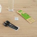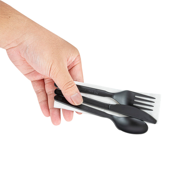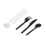 BLACK PLA PLASTIC CUTLERY SET - WITH NAPKIN AND SALT / PEPPER PACKETS