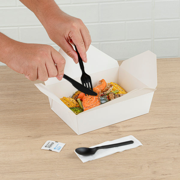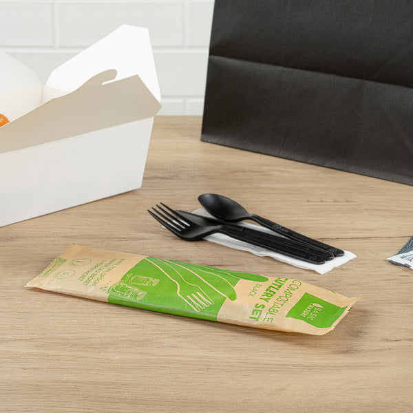Ensure sanitary dining with our wrapped plastic cutlery set. The Basic Nature Compostable Wrapped Plastic Cutlery Set includes a spoon, fork, and knife, providing a complete dining solution and removing the hassle of separate utensil sourcing. Crafted from commercially compostable cPLA, this set offers an eco-friendly alternative to traditional plastics, perfectly aligning with sustainability initiatives. Each plastic fork knife spoon set is individually wrapped, guaranteeing hygiene and cleanliness for takeout and delivery services. For added convenience, this set includes a white napkin and salt/pepper packets, making it a one-stop solution for dining accessories. The medium-weight utensils, ideal for light fare catering, are presented in a sleek black color, ensuring a professional appearance in any setting. Enhance your foodservice operations with this compostable cutlery set. Each order includes 500 Basic Nature Compostable Wrapped Plastic Cutlery Set.