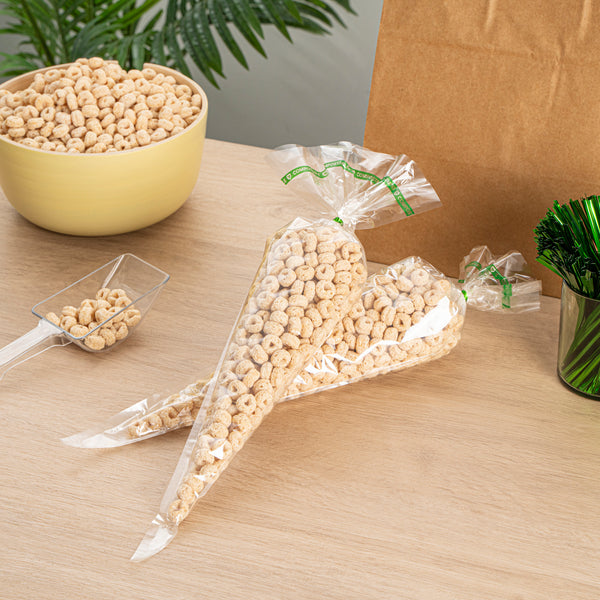Showcase your baked goods with our Basic Nature Clear Plastic Cone Bags. These compostable bread bags are crafted from eco-conscious plastic cellophane, ensuring that your homemade bread stays fresh while being conscious of the environment. These bread packaging bags guarantee that your baked goods remain uncontaminated and wholesome. These wicker poly bags feature a dispenser that makes handling and storing bread loaf bags effortless. This unique bread freezer bag is heat sealable, providing a secure seal to keep your bread fresh even in freezer conditions. With a clear finish, these plastic bread bags showcase your delicious creations while offering easy product identification. Measuring 17.01 inches in length by 7.52 inches in width, these bags for baked goods fit various sizes of bread loaves. Sold in a 100 count box.
