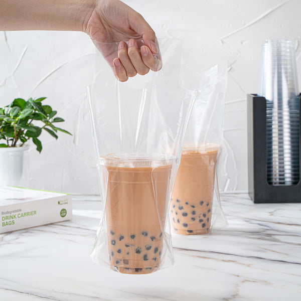 Made from sustainable, low-density polyethylene with a D2W adhesive, these drink to go bags are an excellent alternative to conventional plastic beverage carriers. Keep the planet in mind when packaging boba tea, smoothies, or pressed juices for the road.