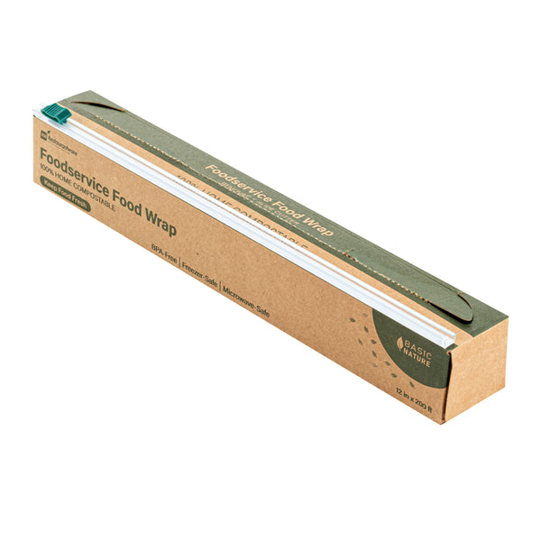 Keep foods fresh with our Basic Nature Clear Plastic Foodservice Food Wrap. Made from premium PLA and PBAT plastic, these cling film wrap secure food tightly without tearing. This BPA-free food cling wrap is biodegradable and home compostable to reduce your facility's carbon footprint. The built-in slide cutter in this plastic food wrap makes it easy to tear away from the dispenser, providing a clean cut that ensures consistent tearing and minimizes tangling. To reheat the food before serving, this kitchen cling film is microwave-safe for up to 2 minutes. Plus, this food cling wrap is freezer-safe for storing the leftovers conveniently. Measuring 200 feet long by 12 inches wide, this cling wrap for food is ideal for use in restaurants, cafes, and delis. Shipped in a 1 count box. This item will only degrade outside of the traditional solid waste stream.
