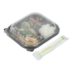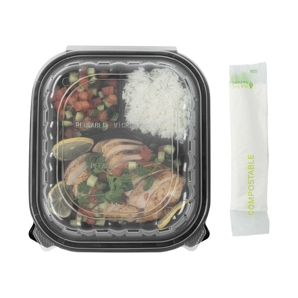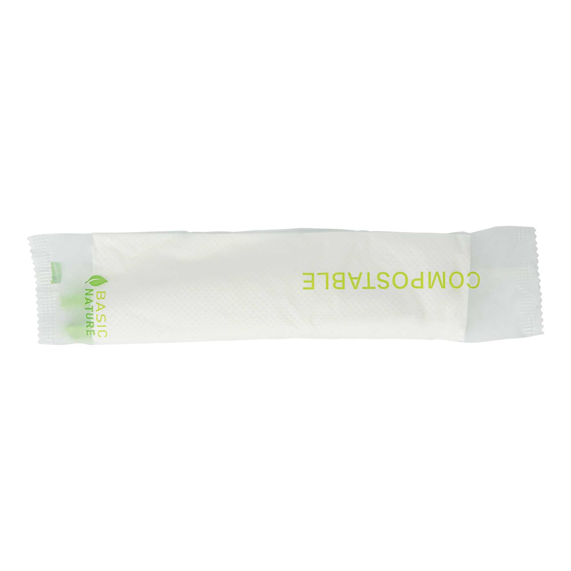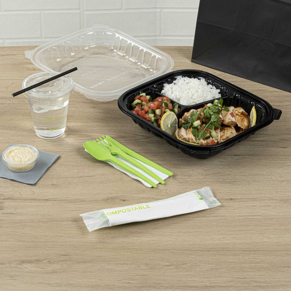 Enhance your eco-friendly dining experience with sustainable utensils. The Basic Nature Compostable Cutlery Set features a reinforced handle that allows you to scoop up hefty bites without breaking, making it an ideal choice for takeout and delivery services seeking a compostable cutlery set. Crafted from premium CPLA plastic, this biodegradable utensil set is heat-resistant up to 180 degrees Fahrenheit, ensuring you can enjoy hot dishes without compromising utensil integrity. Each piece is individually wrapped in a commercially compostable wrapper, which protects the cutlery while minimizing your operation's carbon footprint. The cutlery is embossed with "compostable" on the handle, clearly distinguishing it as an eco-friendly option in any catering event or quick-service restaurant setting. With a length of 6.5 inches, this set fits comfortably in the hand, offering both convenience and sustainability. Choose this compostable knife, fork, and spoon set to complement your environmentally conscious dining solutions. Each order includes 100 Basic Nature Compostable Cutlery Sets.