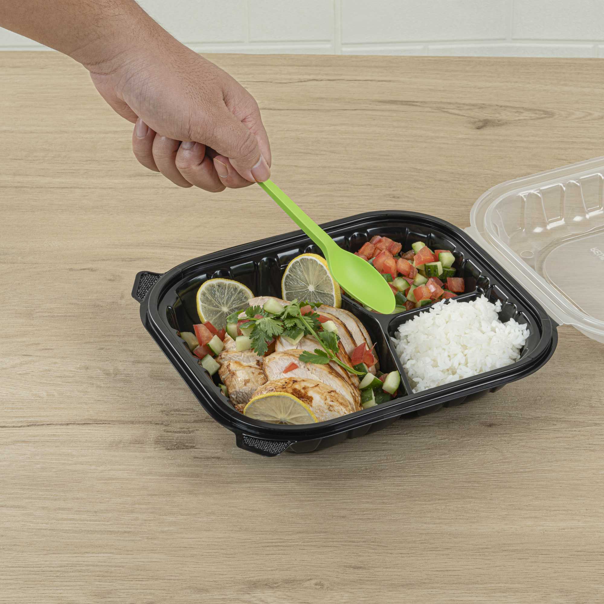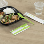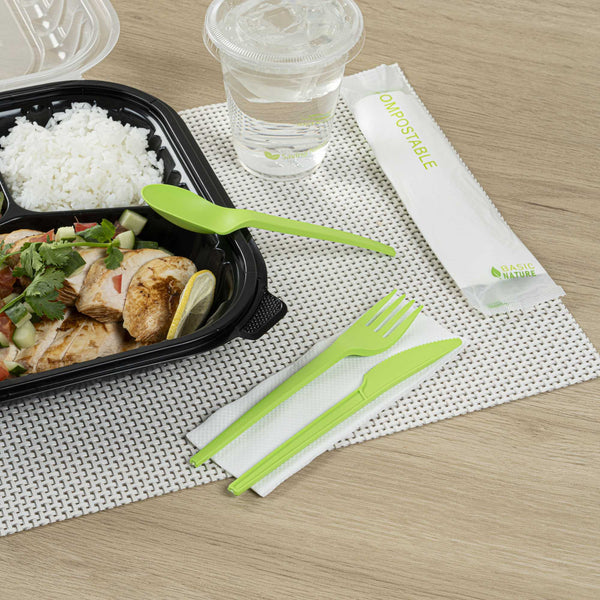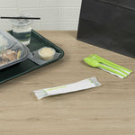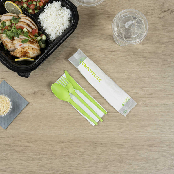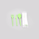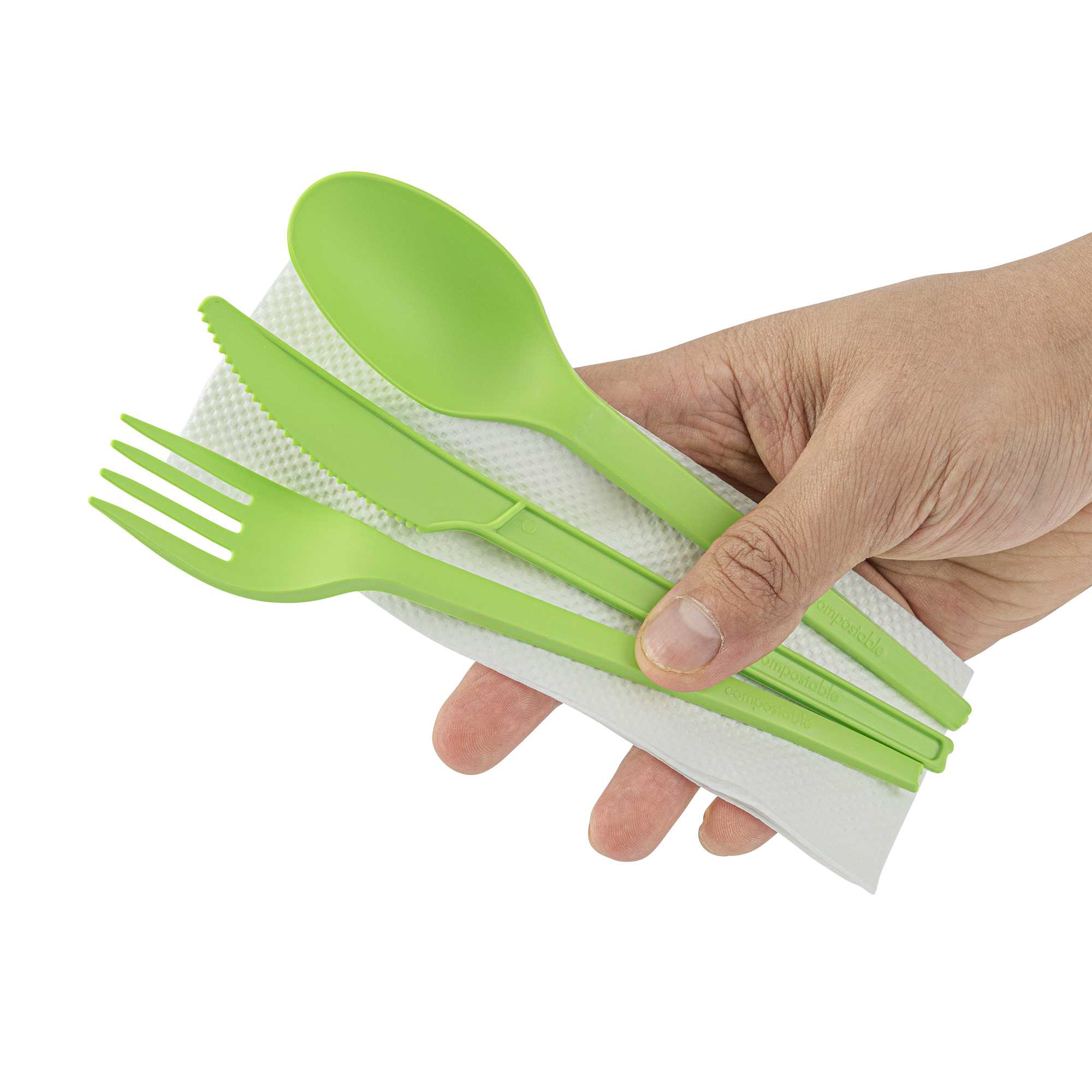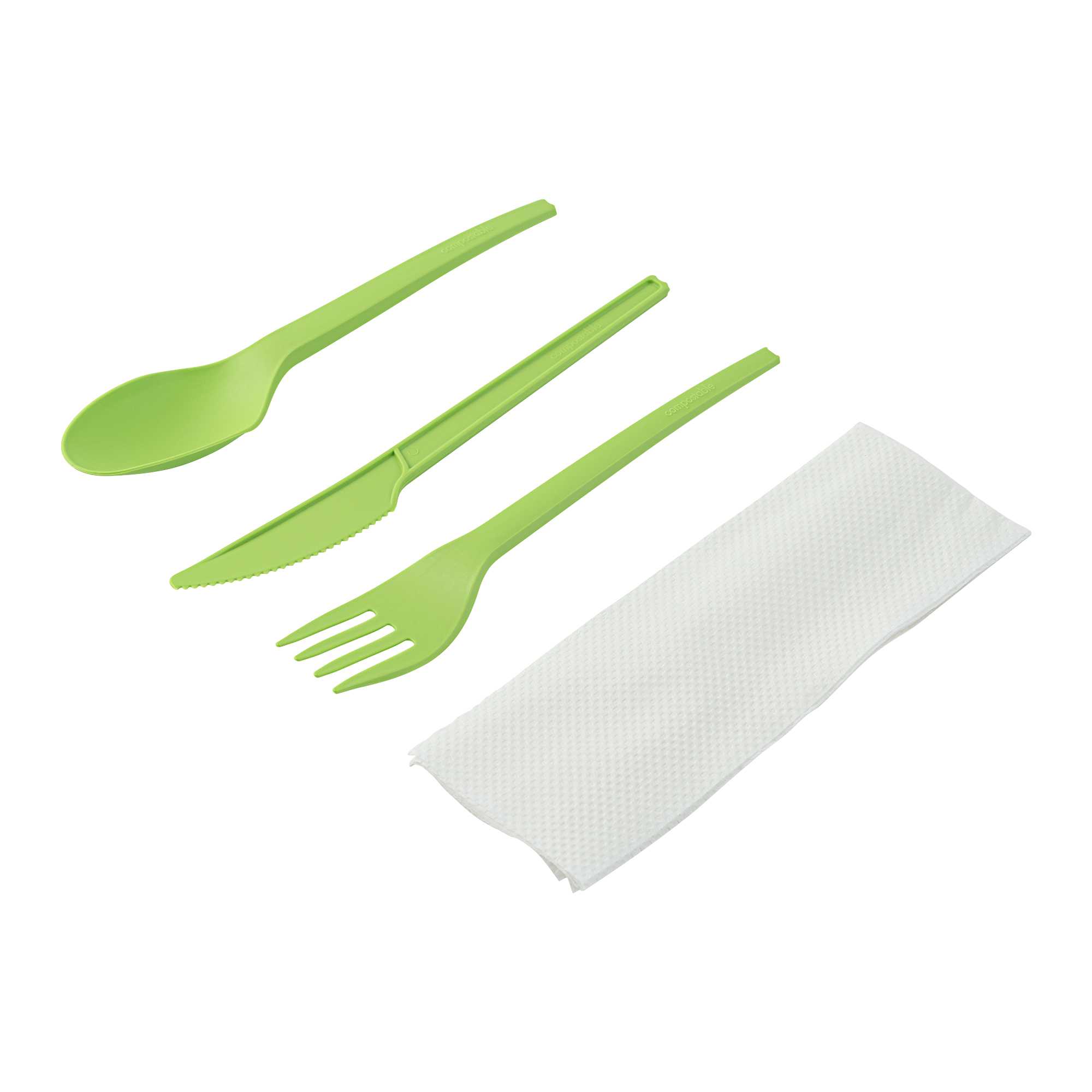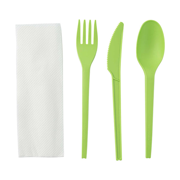 GREEN CPLA PLASTIC CUTLERY SET - WRAPPER, WHITE NAPKIN, HEAT-RESISTANT