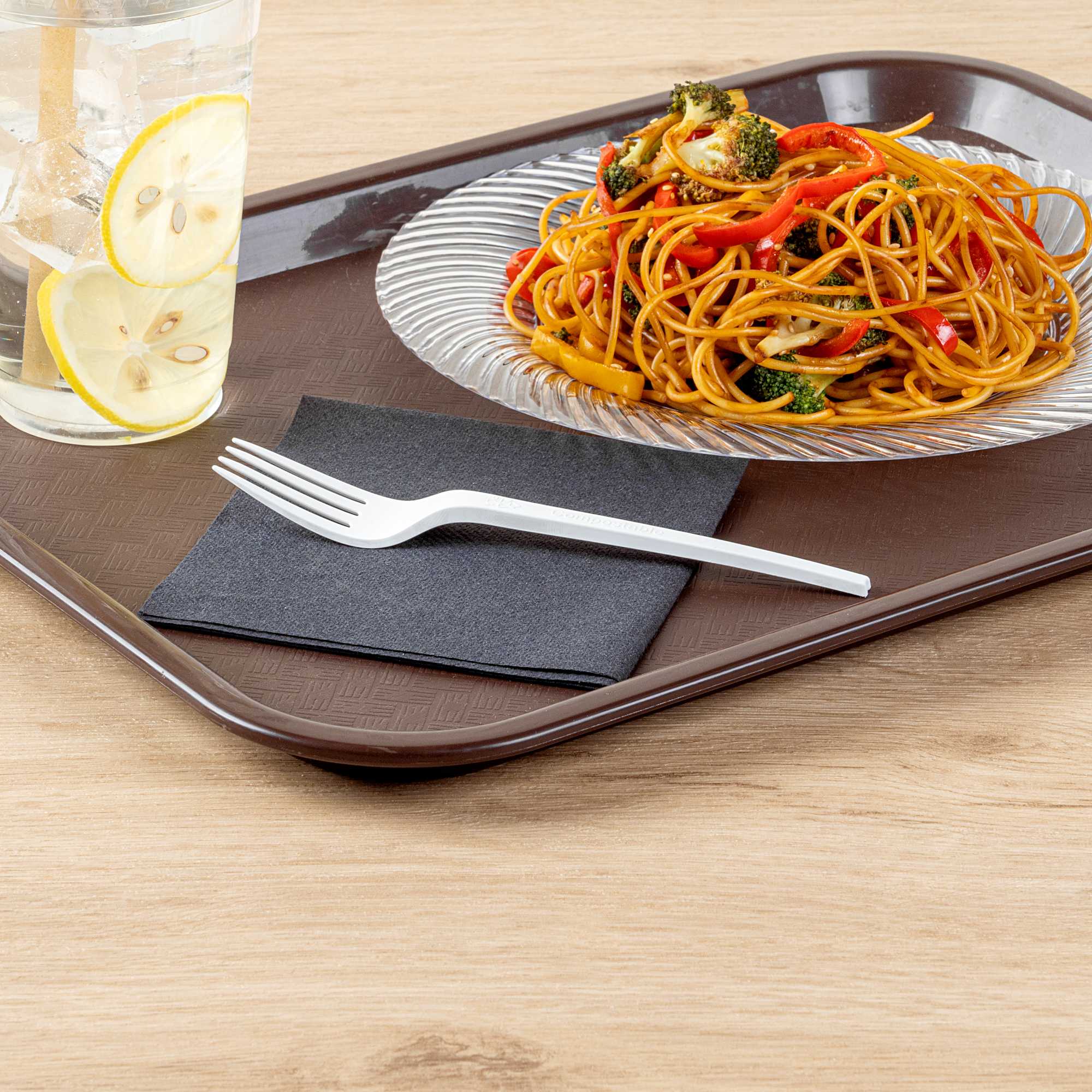 Made from PLA, a cornstarch-based bioplastic, these utensils are compostable with BPI certitifcation. Designed with an embossed "Compostable" message to remind guests of the correct way to dispose of these utensils.