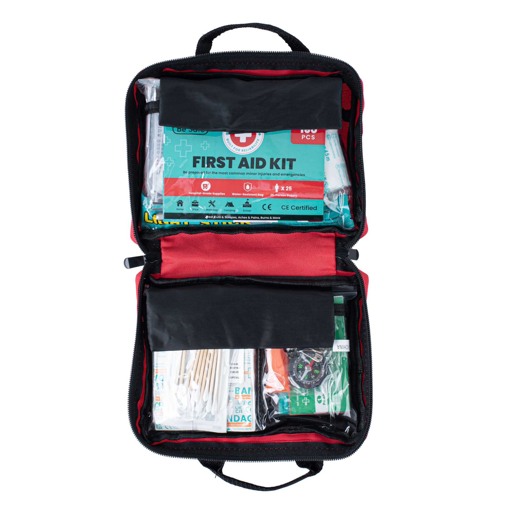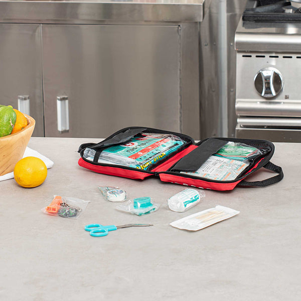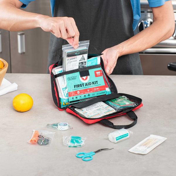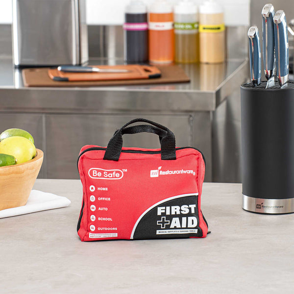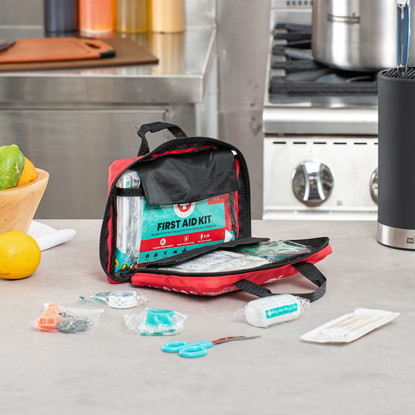 Be prepared for emergencies with our Be Safe 25-Person Class A First Aid Kit. Ideal for offices, travel, home, vehicles, camping, or outdoor worksites, this compact red kit includes essential supplies for treating cuts, scrapes, burns, and more. It features a CPR mask, emergency blanket, cold compress, moleskin pad, tweezers, compass, and glow stick for quick and effective response. An array of adhesive bandages, gauze pads, non-adherent dressings, cleaning wipes, gloves, and safety pins offers broad coverage for first aid needs. Thoughtful extras like a whistle, rain poncho, and first aid guide support safety in unpredictable settings. Organized in a durable, easy-to-carry case for efficient access during urgent moments. Measures 7.87 inches long by 6.3 inches wide by 3.11 inches tall. Sold in a 1 count box.