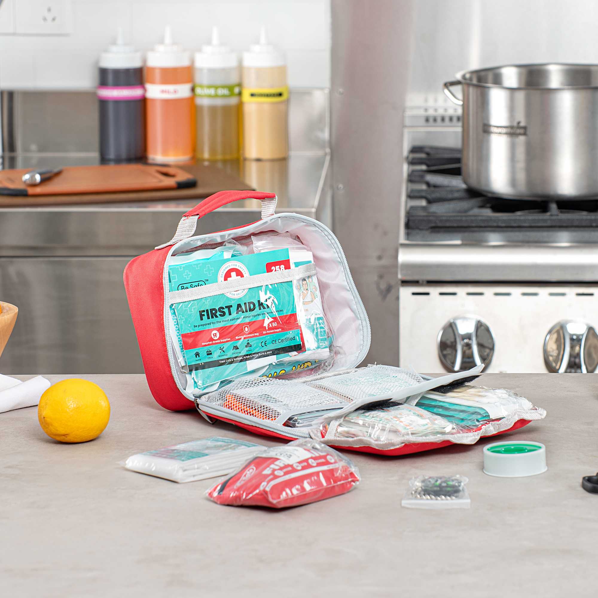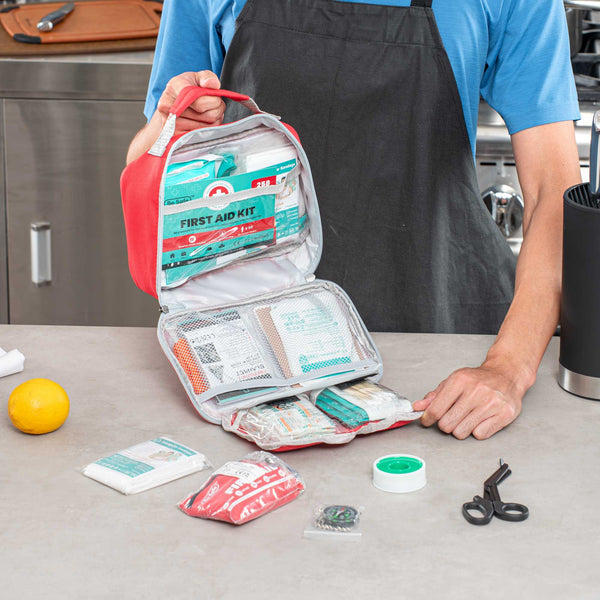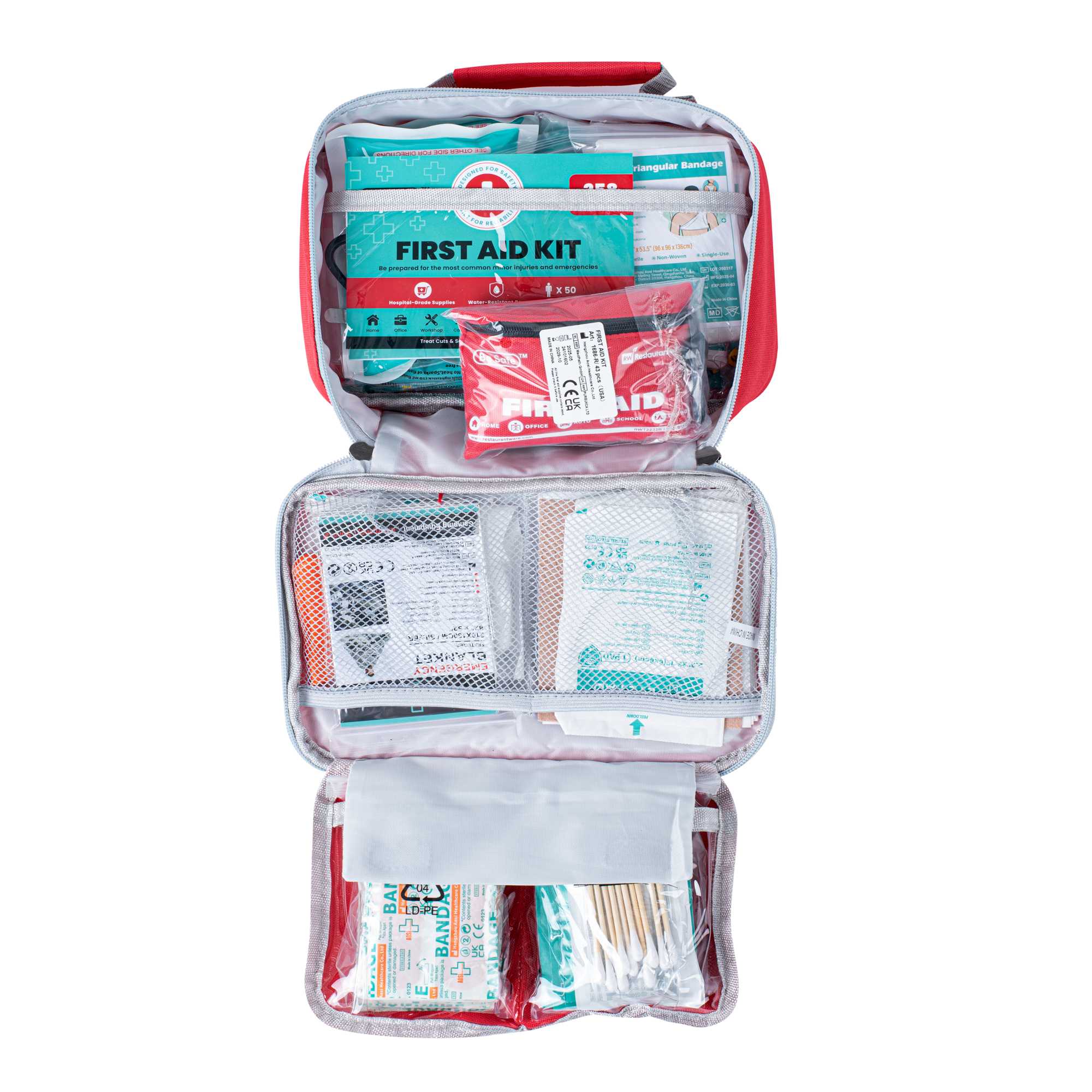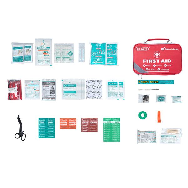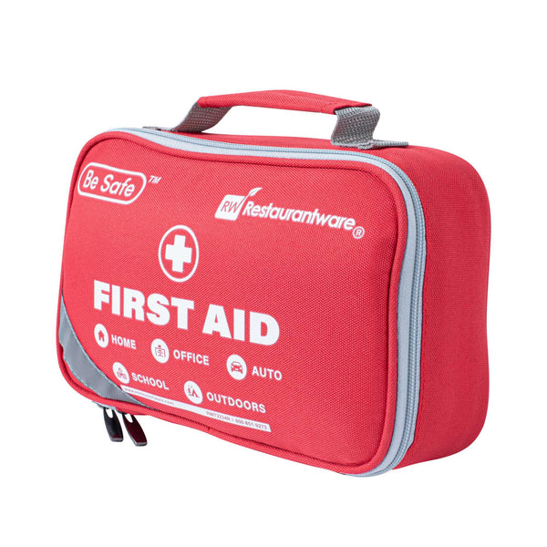Stay fully prepared with our Be Safe 50-Person Class A 2-in-1 First Aid Kit. This versatile kit combines a 215-piece standard set with a 43-piece mini kit, ideal for travel, home, office, vehicles, and workplace safety. It includes essentials like a CPR mask, metal scissors, trauma pad, tweezers, emergency blanket, instant ice packs, and eyewash pads to handle a range of injuries. With a wide selection of adhesive bandages, gauze pads, butterfly closures, cleansing wipes, gloves, and moleskin relief, it supports a quick and effective response. Bonus items like a compass, whistle, glow stick, and triangular bandages add outdoor-readiness. The mini kit is great for portability and contains extra bandages, cotton tips, cleansing pads, and tape. Thoughtfully packed for easy access and organization. Measures 9.45 inches in length by 6.3 inches in width by 2.76 inches in height. Sold in a 1 count box.
