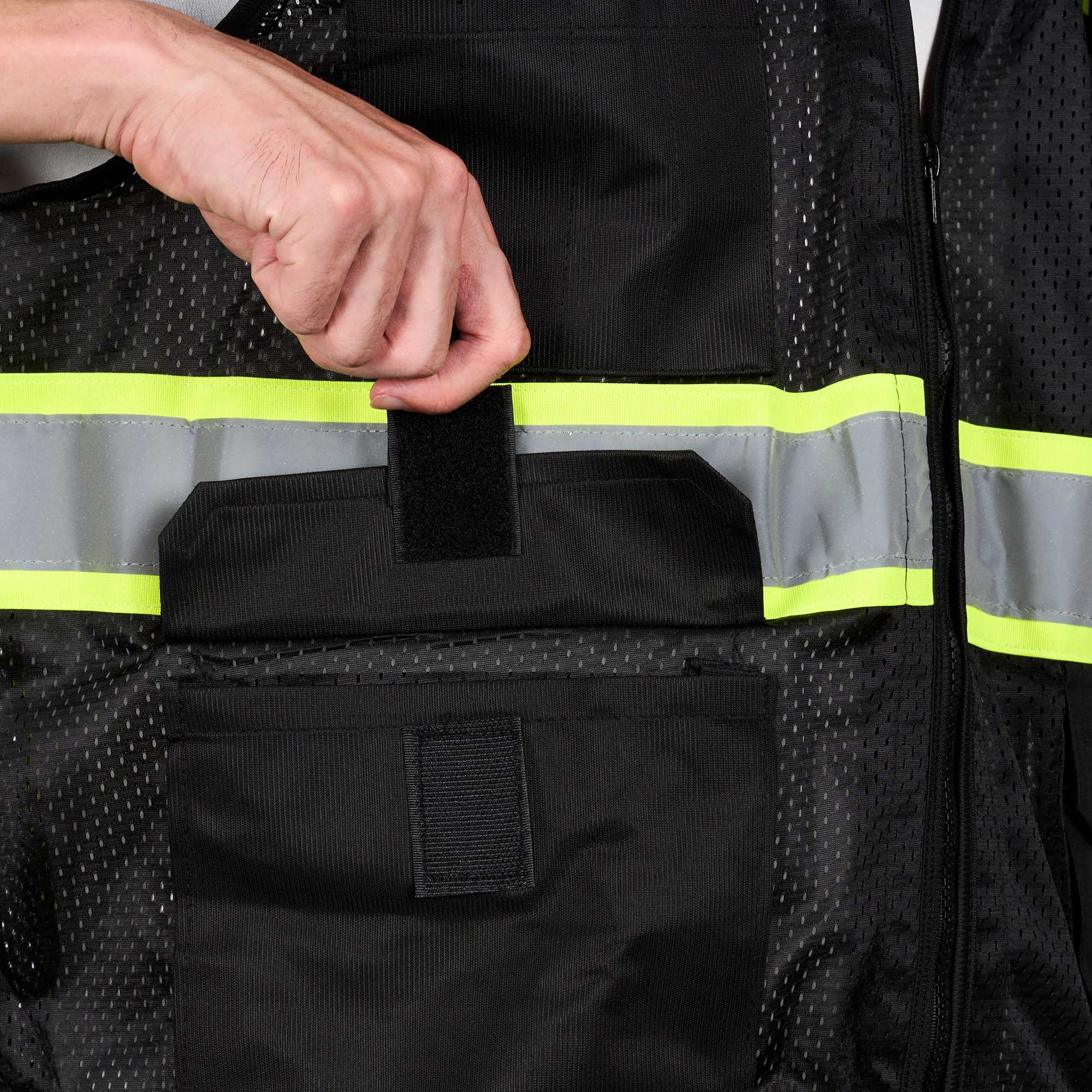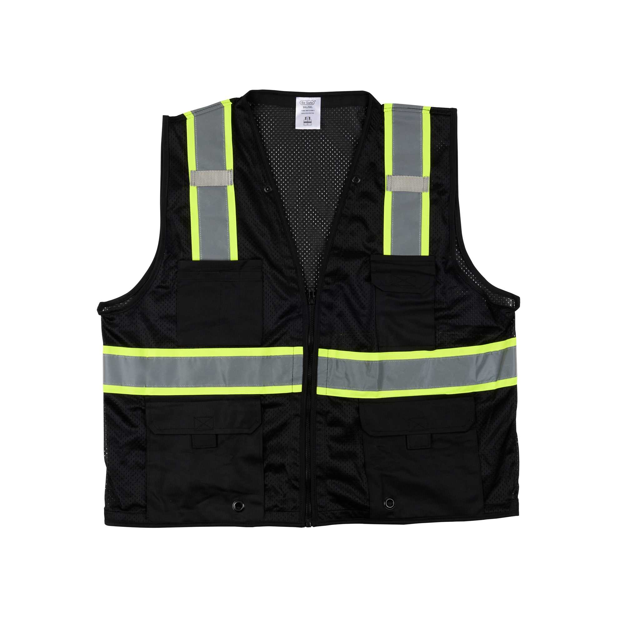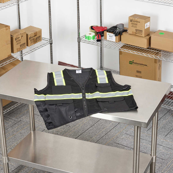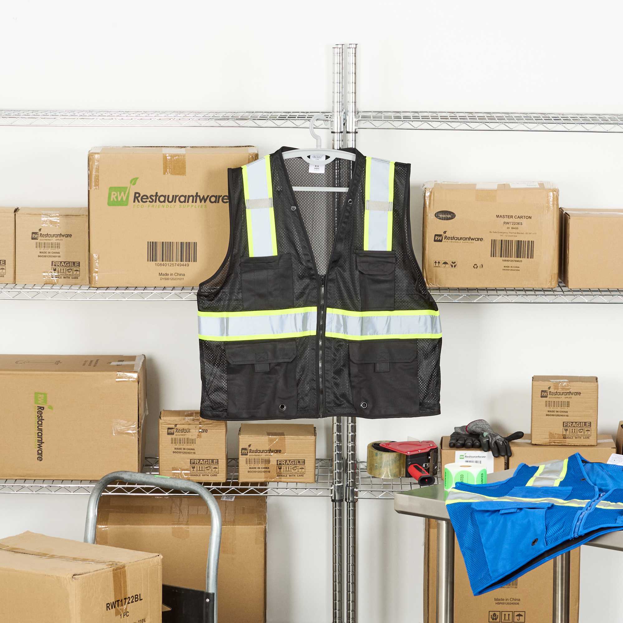 Enhance staff safety and efficiency with our high-visibility solution. The Be Safe Reflective Stripes High Visibility Vest, constructed from black plastic, is specifically designed for warehouse and event staff, ensuring they remain visible in busy environments. This high visibility vest features reflective strips that significantly enhance safety, particularly in dimly lit areas, ensuring your team is always seen. Equipped with multiple pockets, this vest efficiently organizes tools and order pads, streamlining operations and reducing downtime. A convenient zipper front closure allows for quick and secure fitting, making it an essential reflective safety vest for fast-paced settings. With a length of 29.21 inches and a width of 30.32 inches, this vest is both versatile and practical. Its machine washable design aligns with eco-friendly practices, supporting sustainability in your operations. Sold in a 1 count box.