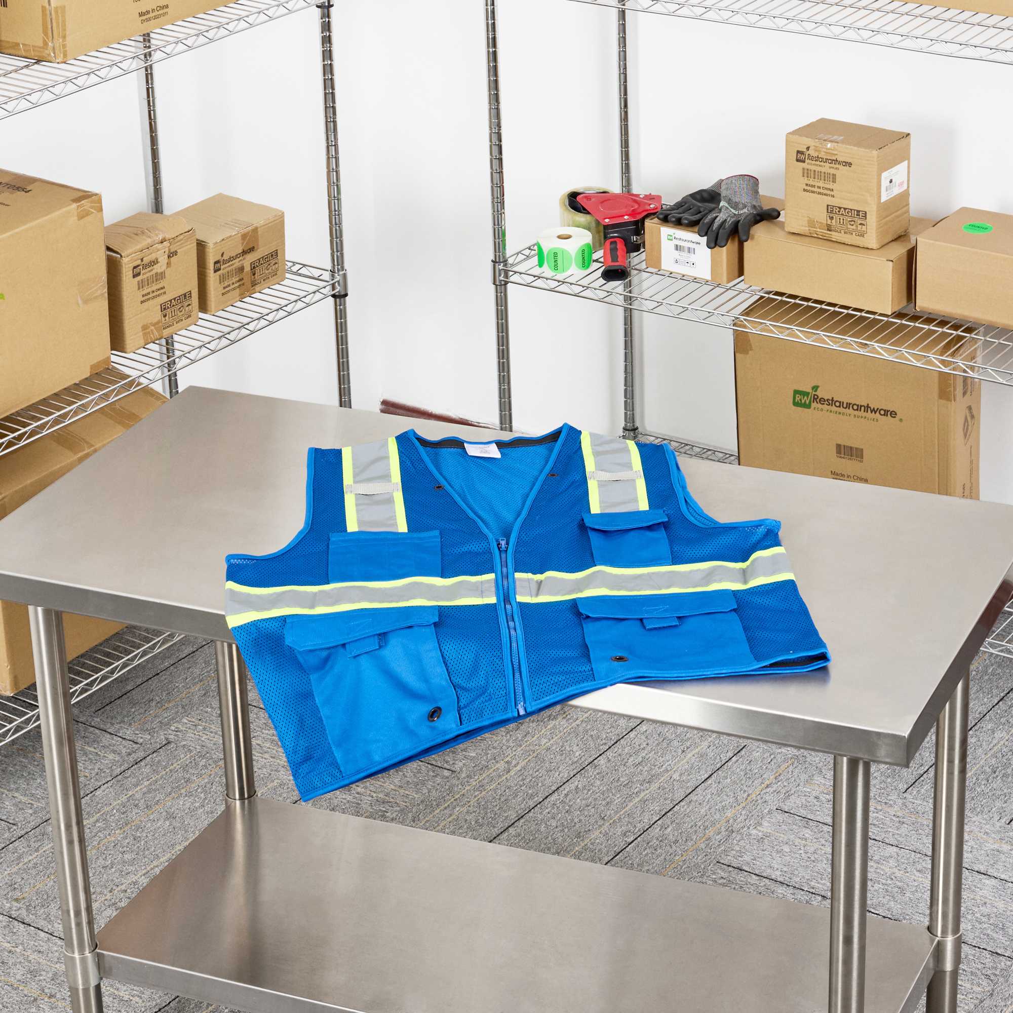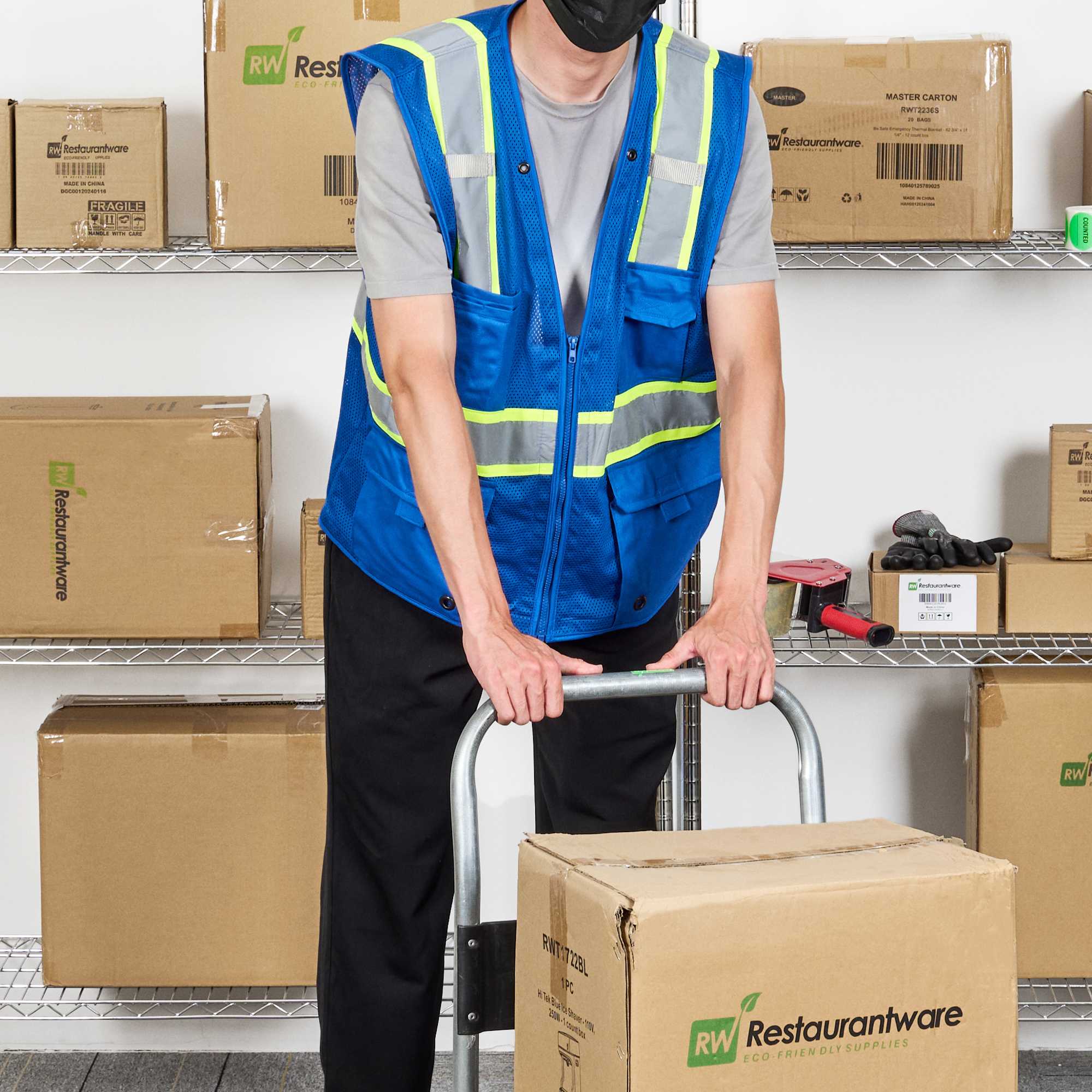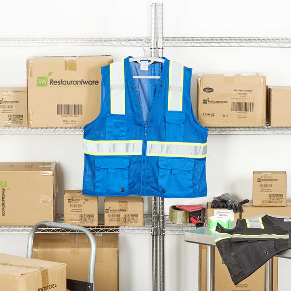 Ensure ultimate safety and organization with our sleek high visibility vest. The Be Safe Reflective Strips High Visibility Vest is expertly designed with a high-visibility blue color to enhance staff safety in bustling kitchen environments. This reflective safety vest features multiple pockets, providing seamless organization for tools and order pads to improve workflow efficiency. With a convenient zipper front closure, our multi-pocket safety vest ensures a quick and secure fit, essential for fast-paced foodservice settings. This vest is both machine washable and environmentally conscious, supporting sustainable practices in your operations. Measuring 27.99 inches in length and 27.56 inches in width, this vest provides a comfortable fit for various body types Sold in a 20 count box.