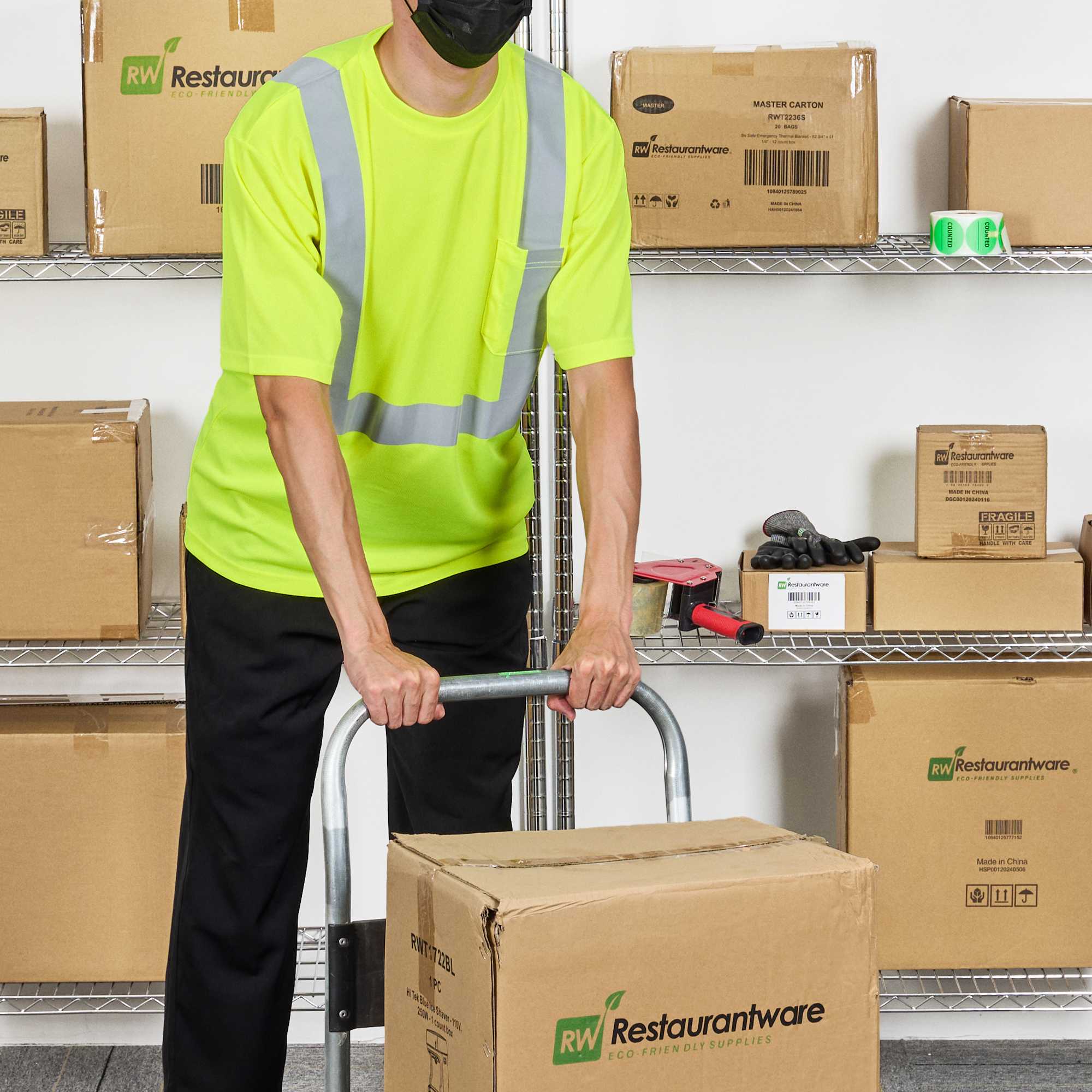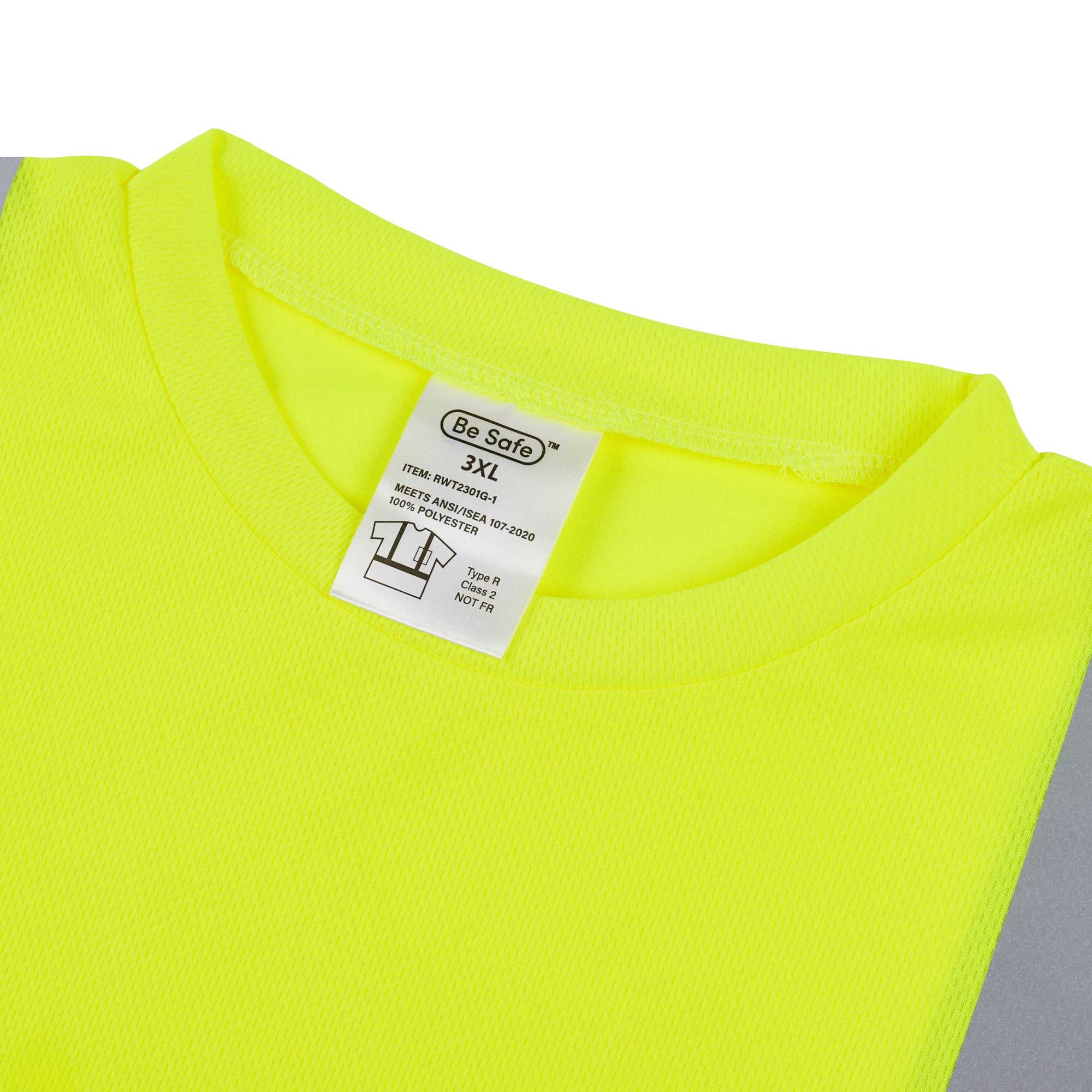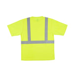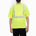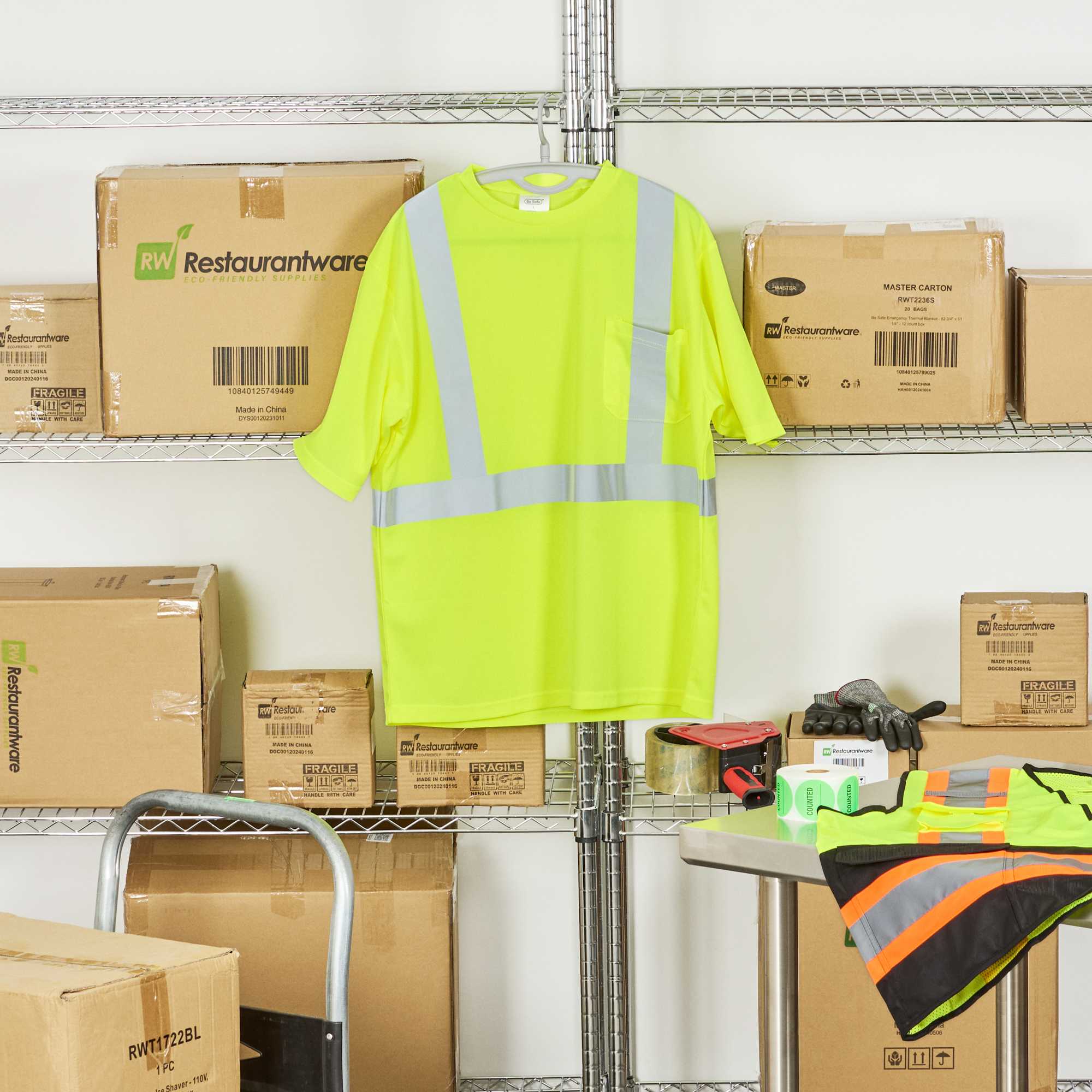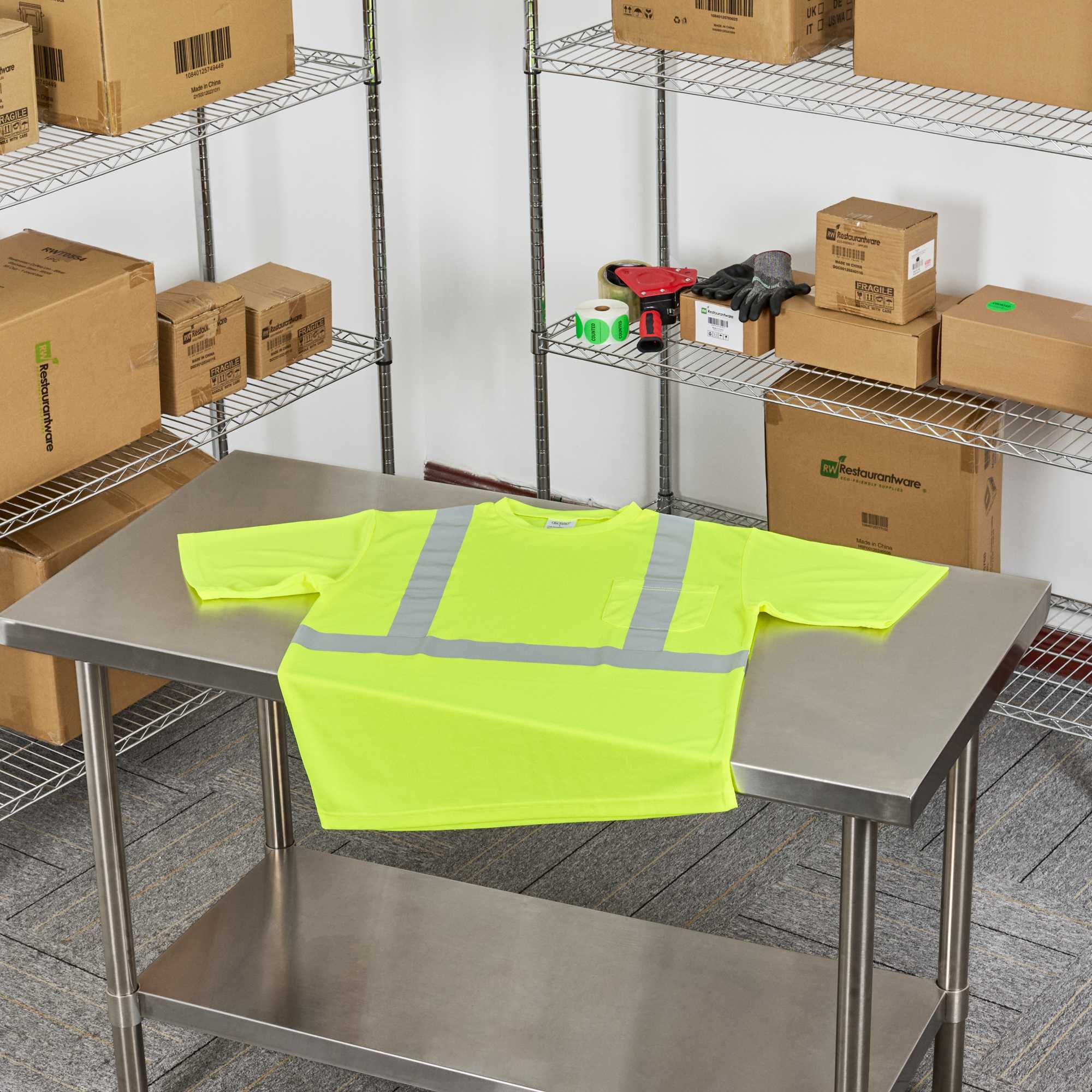 Enhance safety and visibility in bustling environments. The Be Safe Reflective Striping hi vis t-shirt offers a hi-vis lime color, maximizing worker visibility in busy kitchens and work zones. Constructed from moisture-wicking plastic, this reflective work shirt ensures comfort during long shifts, while its silver reflective stripes meet government Class 2 safety standards, providing enhanced safety during night operations. Measuring 33.27 inches in length and 30.08 inches in width, this class 2 safety t-shirt includes a convenient chest pocket for quick access to order pads or small tools, essential for efficient service. Machine washable, it supports sustainable practices and easy maintenance, making it ideal for high-turnover environments. Each order includes 20 vests.