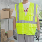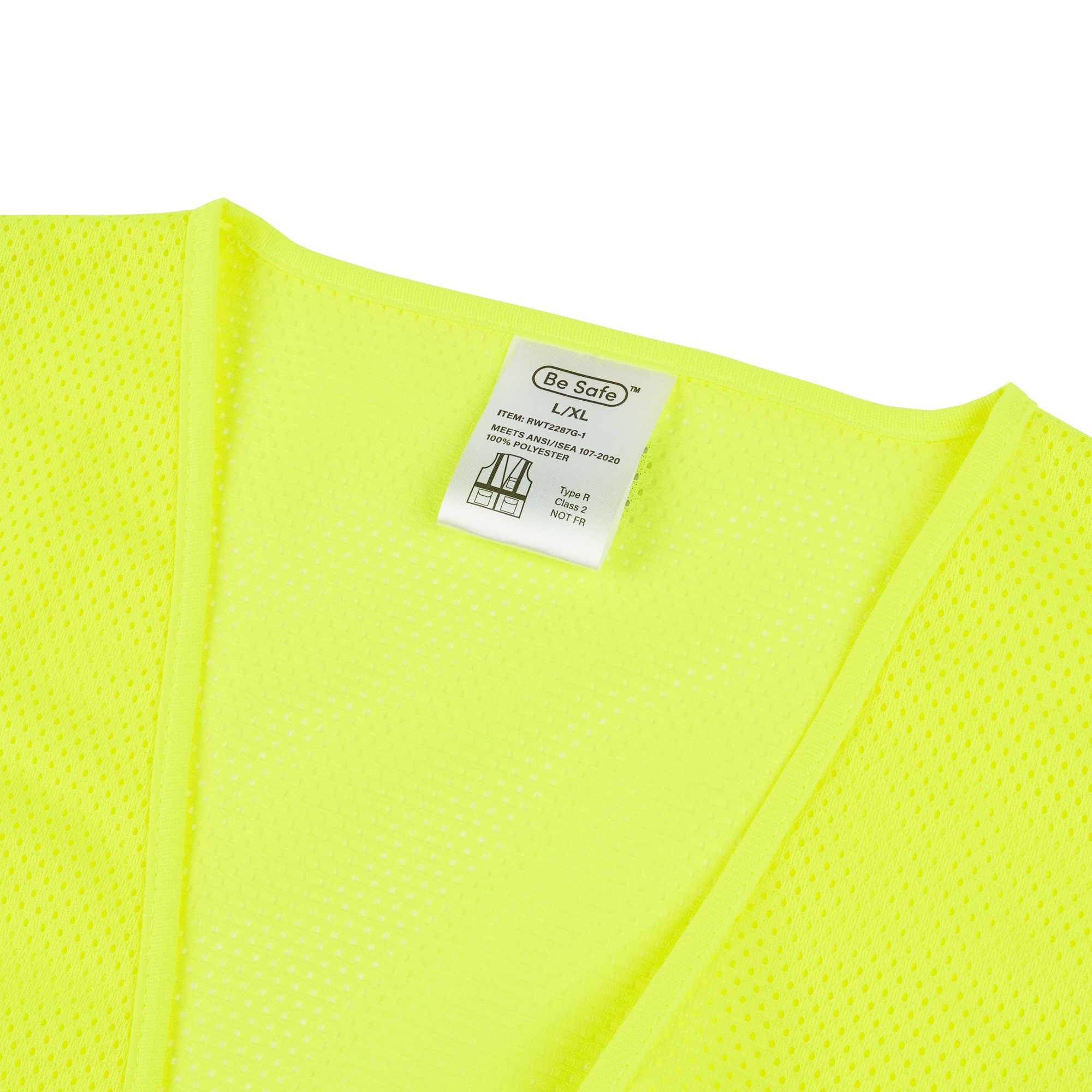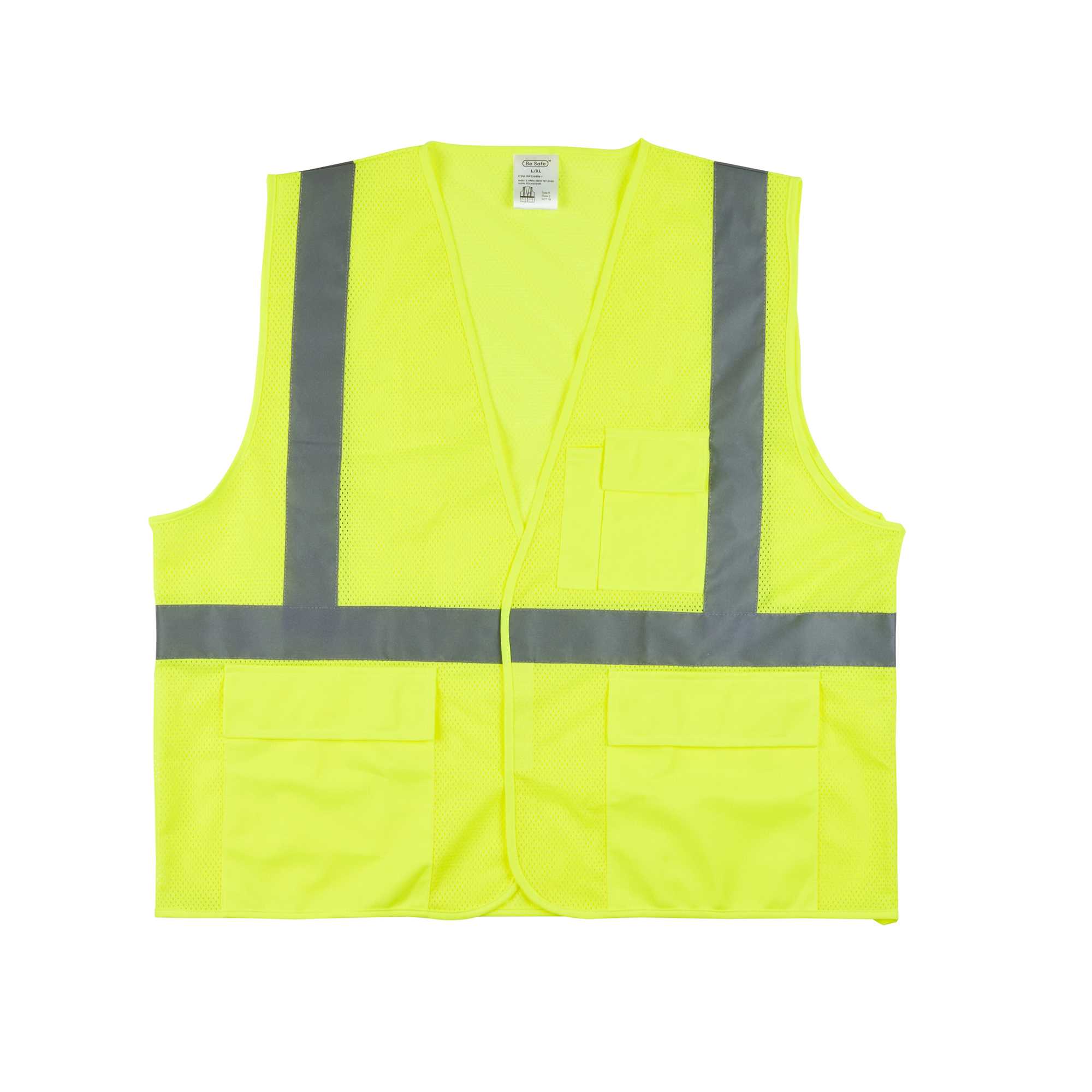 Promote on-site safety with our Be Safe Type R Class 2 Lime L/XL High Visibility Mesh Safety Vests. Designed for larger fits, these mesh safety vests feature bold lime coloring and reflective tape to enhance visibility in dimly lit or hazardous environments. The breathable polyester mesh construction offers superior airflow, helping to keep workers comfortable through extended wear. Equipped with a secure hook-and-loop closure, these hi-vis vests allow for fast and reliable wearability on the job. Multiple pockets are integrated for easy storage of tools, pens, or checklists to maintain productivity on-site. Built from machine-washable plastic, these safety vests are recyclable, supporting eco-conscious workplace operations. Measuring 27.9 inches in length by 27.5 inches in width, these vests offer a comfortable fit without compromising mobility. Sold in a 20 count box.