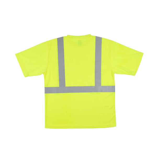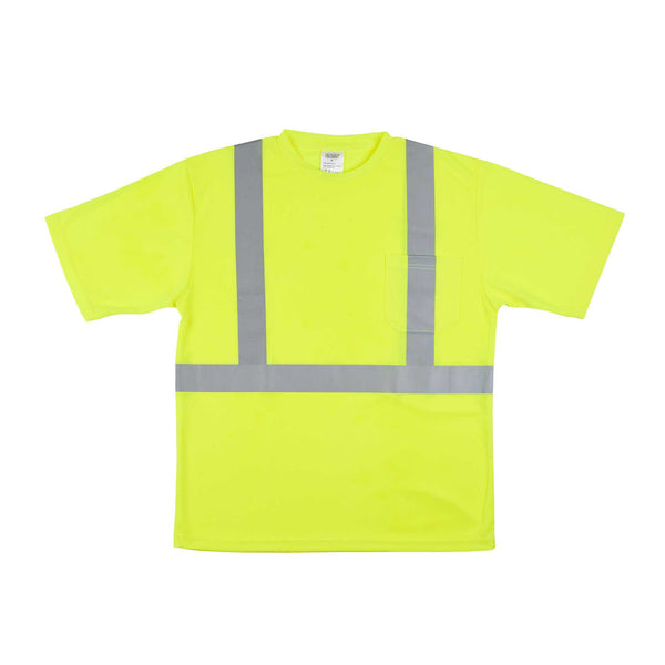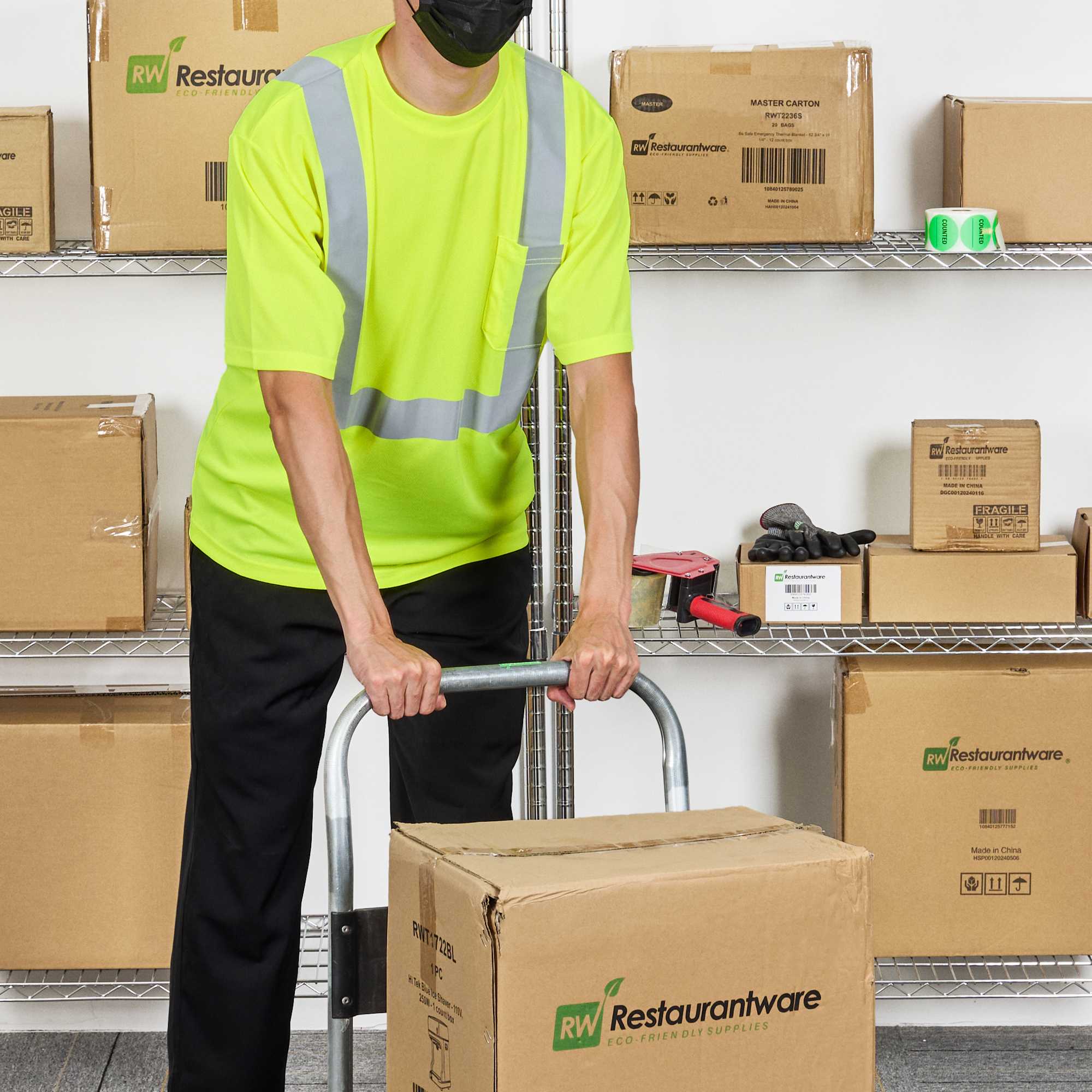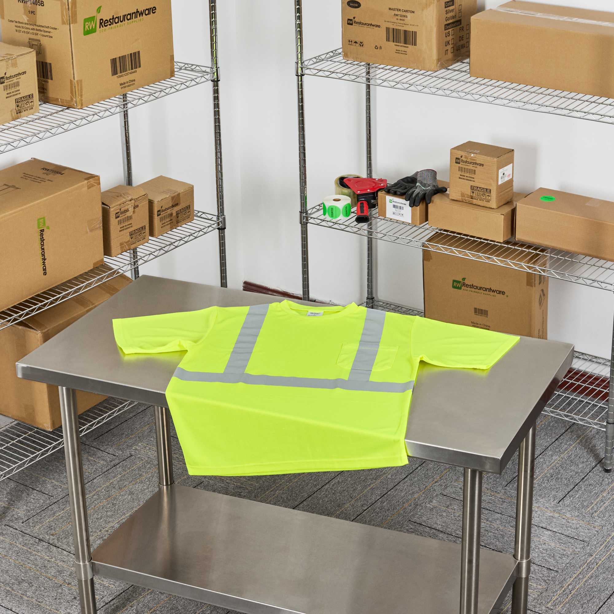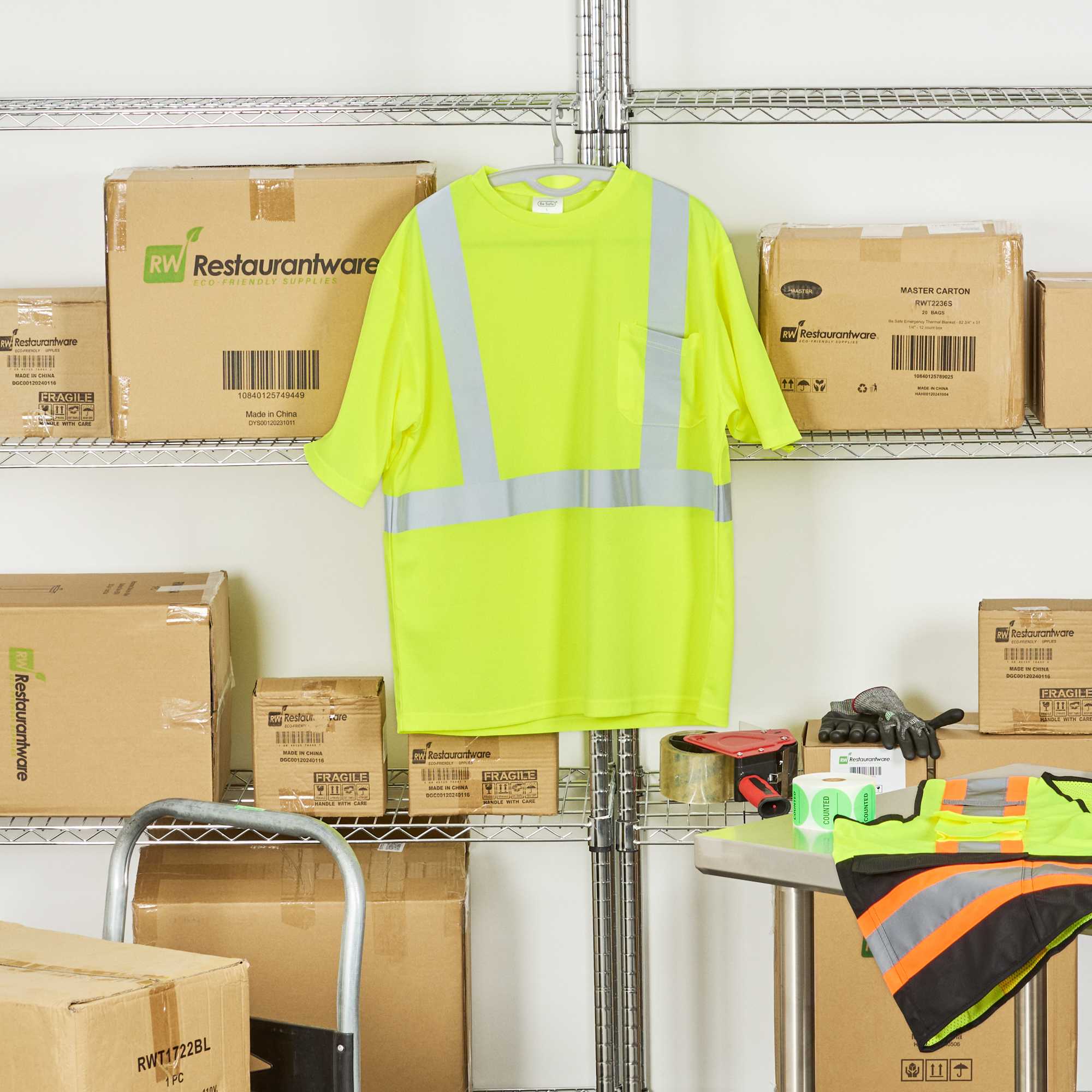 Ensure your team stands out in any environment. The Be Safe Reflective Striping High Visibility T-Shirt - Lime, Plastic, Moisture-Wicking, Chest Pocket, 27.20 inches x 20.79 inches x 0.20 inches enhances staff visibility with its hi-vis lime color, perfect for busy kitchen settings. Featuring Class 2 reflective stripes, this reflective safety shirt meets government regulations, providing increased safety during nighttime or low-light deliveries. The left chest pocket offers convenient storage for pens and order pads, essential for organized and efficient service. Made from moisture-wicking plastic material, this construction safety shirt is machine washable, ensuring long-term use and eco-friendly disposal. Equip your staff with reliable safety gear that doesn't compromise on functionality or comfort. Each order includes 20 vests.