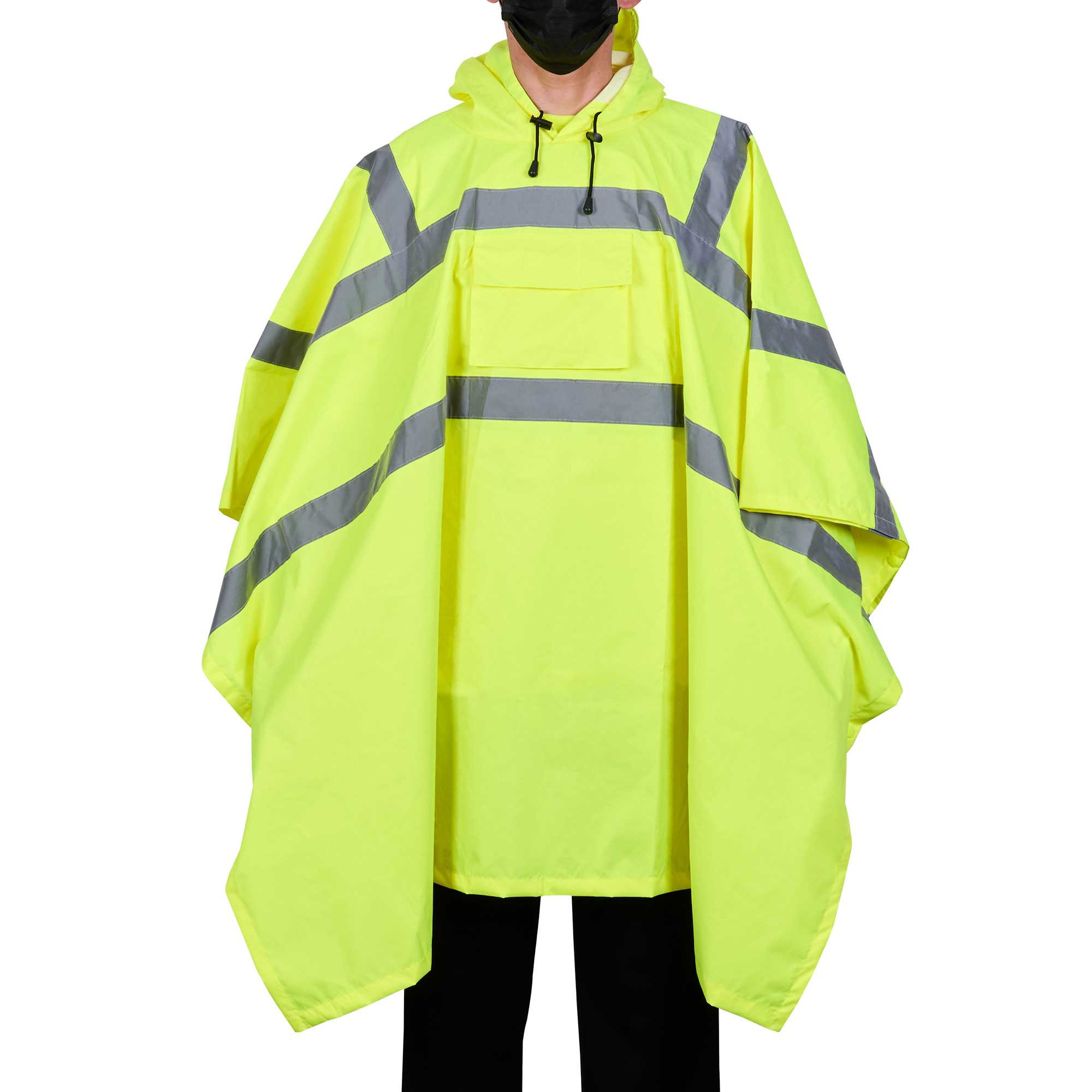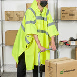 Enhance safety and visibility with this protective gear. The Be Safe Waterproof Waterproof Poncho - Lime, Plastic, Reflective, Windproof, 55.12 inches x 80 inches is designed with a hi-vis lime color to ensure staff visibility on-site, making it an essential waterproof poncho for outdoor workers. This reflective rain poncho features Class 3 reflective stripes, significantly enhancing safety in dim environments. Made from durable plastic, its 100% waterproof design with stitched and taped seams ensures reliable protection against the elements while remaining breathable for comfort on summer days. The hooded rain poncho's snap side closure allows for quick removal during emergencies, ensuring that your team can respond swiftly to any situation. Its machine-washable property adds convenience, making it easy to maintain cleanliness and hygiene. Equip your staff with this recyclable, windproof poncho to boost safety in high-risk environments. Sold in a 1 count box.