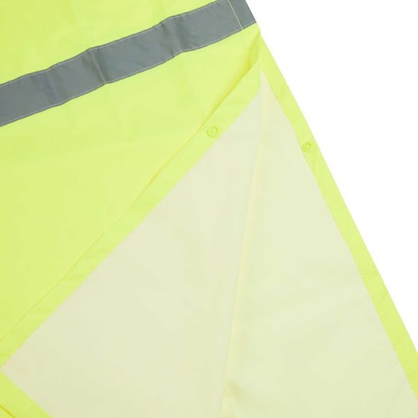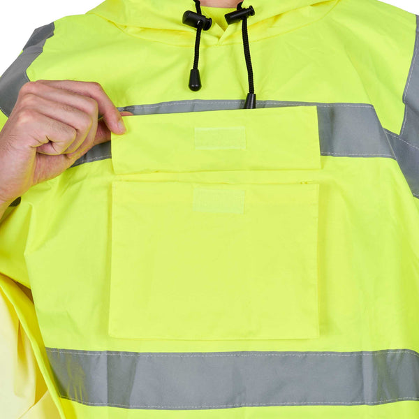 Enhance safety and visibility with this protective gear. The Be Safe Waterproof Waterproof Poncho - Lime, Plastic, Reflective, Windproof, 55.12 inches x 80 inches is designed with a hi-vis lime color to ensure staff visibility on-site, making it an essential waterproof poncho for outdoor workers. This reflective rain poncho features Class 3 reflective stripes, significantly enhancing safety in dim environments. Made from durable plastic, its 100% waterproof design with stitched and taped seams ensures reliable protection against the elements while remaining breathable for comfort on summer days. The hooded rain poncho's snap side closure allows for quick removal during emergencies, ensuring that your team can respond swiftly to any situation. Its machine-washable property adds convenience, making it easy to maintain cleanliness and hygiene. Equip your staff with this recyclable, windproof poncho to boost safety in high-risk environments. Sold in a 20 count box.