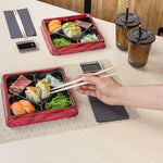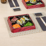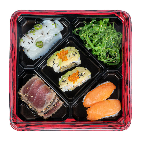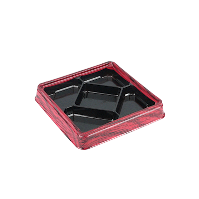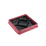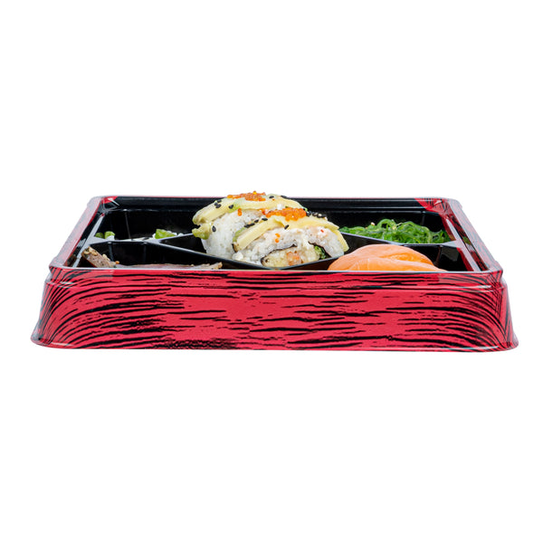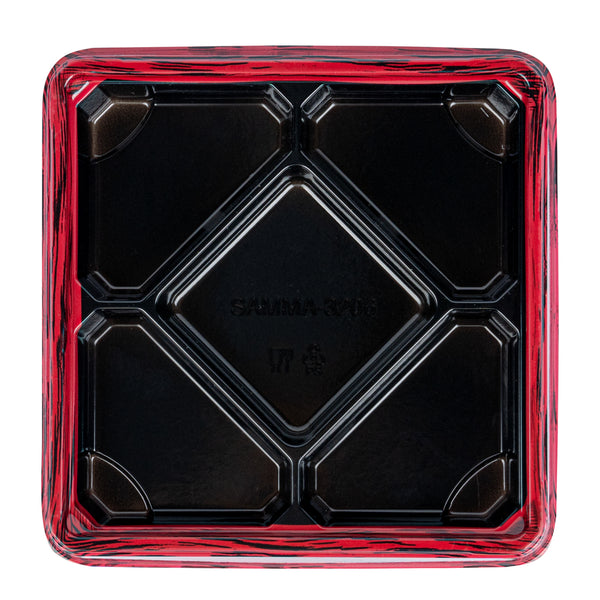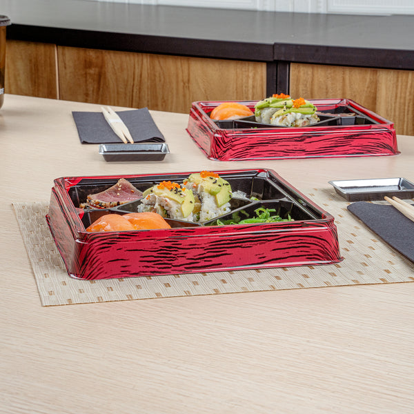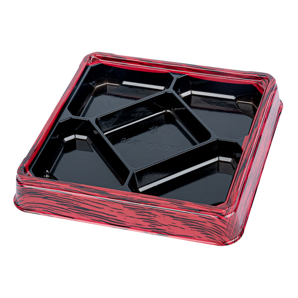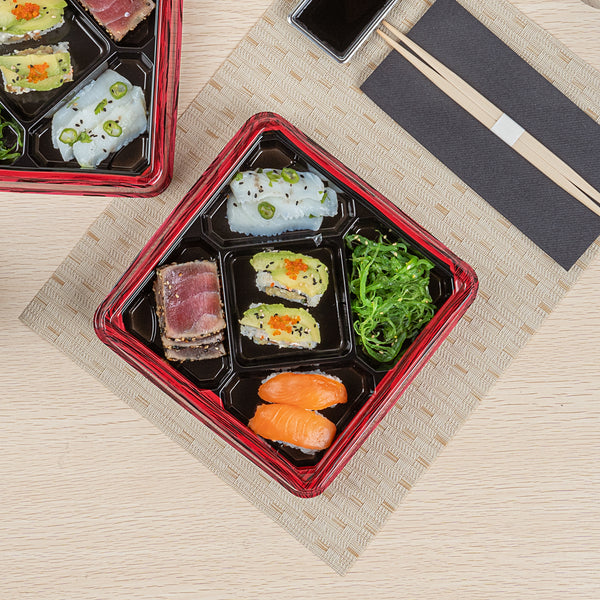 19 OZ SQUARE RED AND BLACK PLASTIC BENTO BOX - 5 COMPARTMENTS