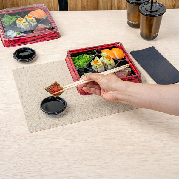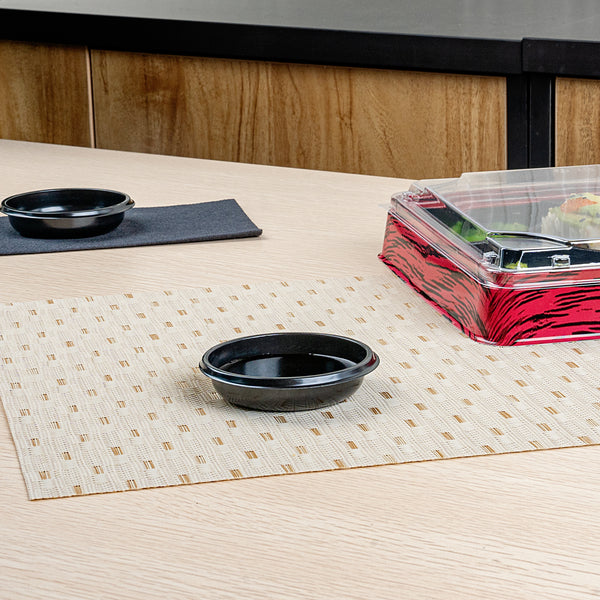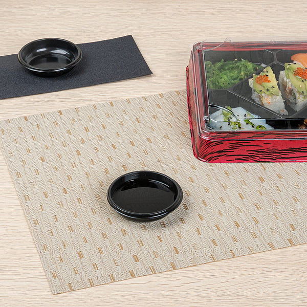 Serve soy sauce with our Bento Tek 2-ounce Round Black Plastic Sauce Dishes. Created from premium plastic, these sauce dishes are durable and sturdy, making them ideal for holding sauces, dip, and condiments. These dip dishes are versatile and excellently display your soy sauce with exquisite sushi at a buffet or serve tangy ketchup with crispy onion rings at foodservice establishments. The classic round shape of these sauce plates provides a timeless and elegant look, suitable for any dining experience. With an elegant black finish, these sauce bowls complement a wide variety of table settings. These soy sauce bowls are disposable and can be discarded after use for an easy cleaning experience. Ideal for eco-conscious restaurants, these disposable sauce bowls are recyclable. Measuring 3 inches in diameter by 0.75 inches in height, these black sauce plates can hold up to 2 ounces. Sold in a 100 count box.