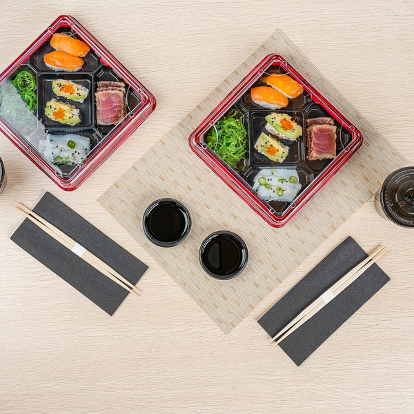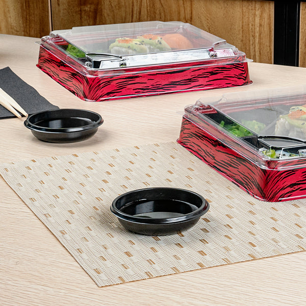 Serve soy sauce with our Bento Tek 2-ounce Round Black Plastic Sauce Dishes. Created from premium plastic, these sauce dishes are durable and sturdy, making them ideal for holding sauces, dip, and condiments. These dip dishes are versatile and excellently display your soy sauce with exquisite sushi at a buffet or serve tangy ketchup with crispy onion rings at foodservice establishments. The classic round shape of these sauce plates provides a timeless and elegant look, suitable for any dining experience. With an elegant black finish, these sauce bowls complement a wide variety of table settings. These soy sauce bowls are disposable and can be discarded after use for an easy cleaning experience. Ideal for eco-conscious restaurants, these disposable sauce bowls are recyclable. Measuring 3 inches in diameter by 0.75 inches in height, these black sauce plates can hold up to 2 ounces. Sold in a 1,000 count box.