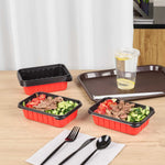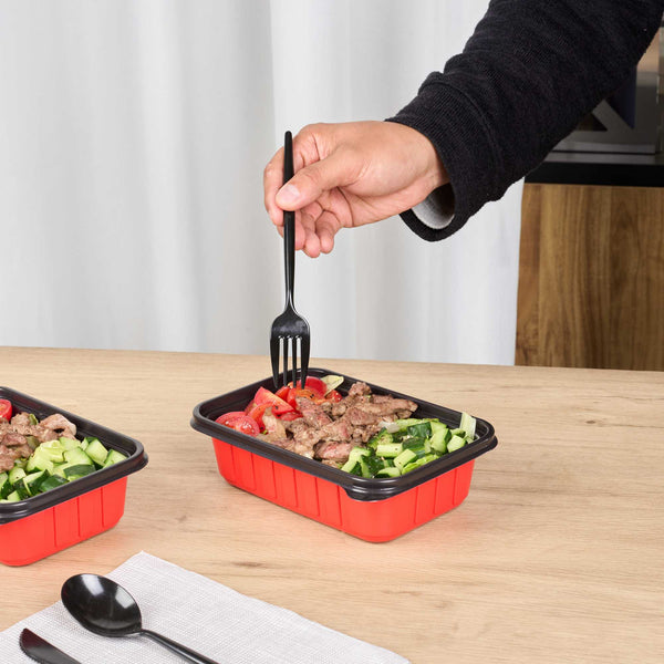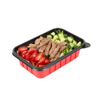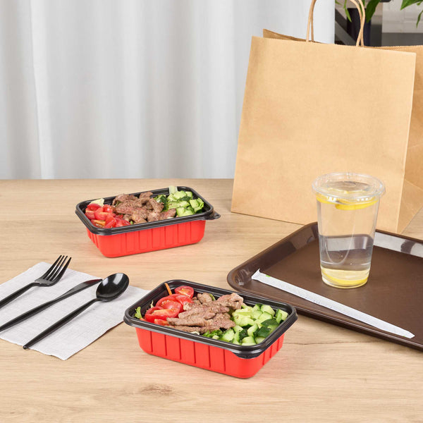 Ensure reliable meal packaging with our Bento Tek 22-ounce Rectangle Red Plastic To Go Boxes. Designed for microwave use, these containers allow for fast and convenient reheating. Crafted from durable, crack-resistant plastic and BPA-free, they’re an ideal solution for a wide range of foodservice operations. Match these food containers with our corresponding clear lids (SKU: RWP1924C) to achieve a tight closure that keeps meals fresh and intact during transport. With a sleek red and black dual-tone exterior, these take out boxes offer enhanced presentation and elevate the perceived value of your delivery orders. Their stackable design minimizes space usage in delivery bags, ensuring tidy and efficient handling for staff and customers alike. These disposable containers also help streamline operations while preventing messy leaks. Each to go box measures 7.17 inches in length by 4.84 inches in width by 2.01 inches in height, providing a 22-ounce capacity that’s ideal for generous portions or layered dishes. Sold in a 200 count box.