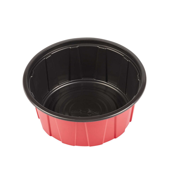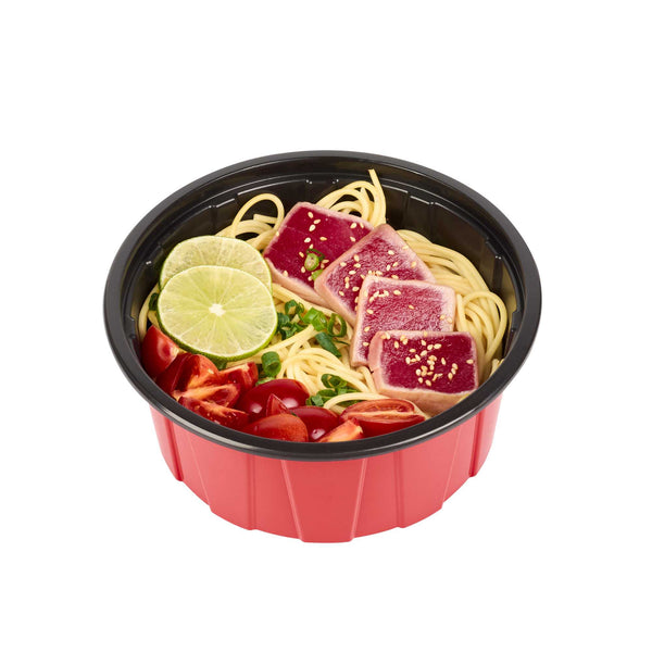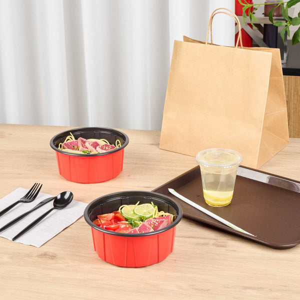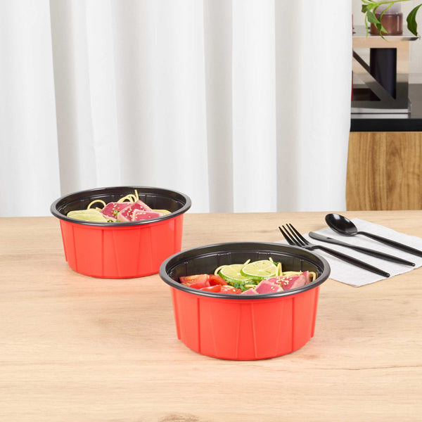 Confidently serve entrees, salads, or layered meals with our Bento Tek 42-ounce Round Red Plastic To Go Boxes. Made from BPA-free, crack-resistant plastic, these durable containers are designed to perform reliably in busy foodservice environments. Their microwave-safe build allows for easy reheating, offering added convenience for take out and delivery. Featuring a bold red exterior paired with a sleek black interior, they enhance the presentation of your dishes while supporting a professional, branded look. Combine them with our compatible clear plastic lids (SKU: RWP1920C-50) for a tight, leak-resistant seal that helps maintain freshness on the go. Their stackable design ensures efficient packing and organization in delivery setups. Measuring 7.09 inches in diameter by 3.15 inches in height, each container accommodates up to 42 ounces. Sold in a 50 count box.