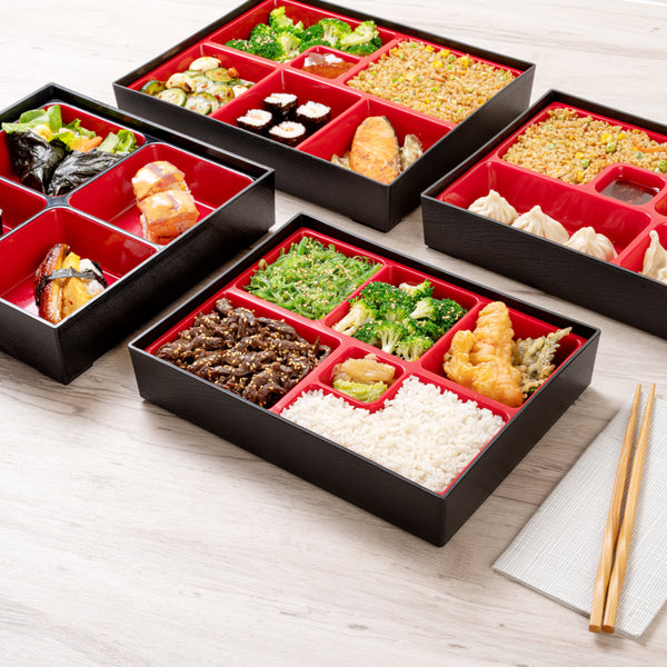 With a sleek black and red finish, these reusable bento boxes, plates, or trays stylishly present meals. Impress guests with elegant food containers!