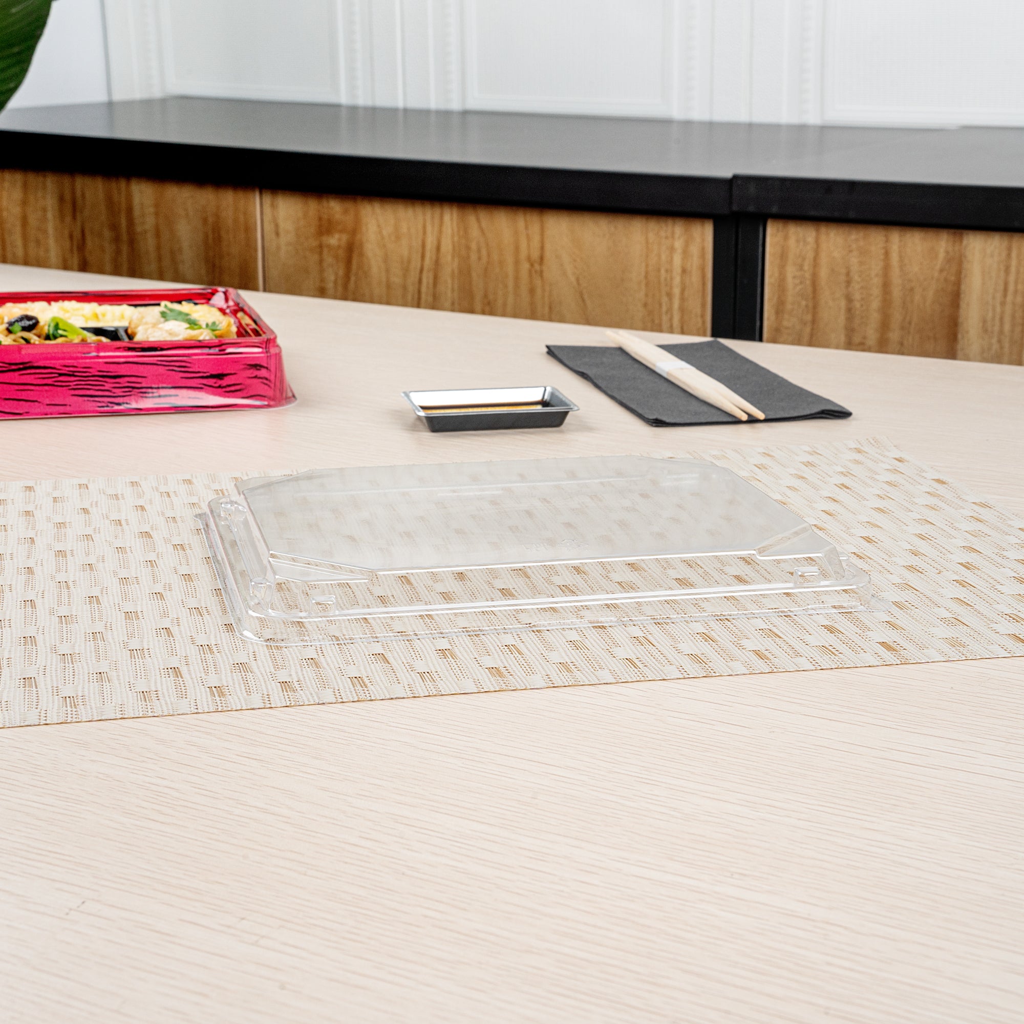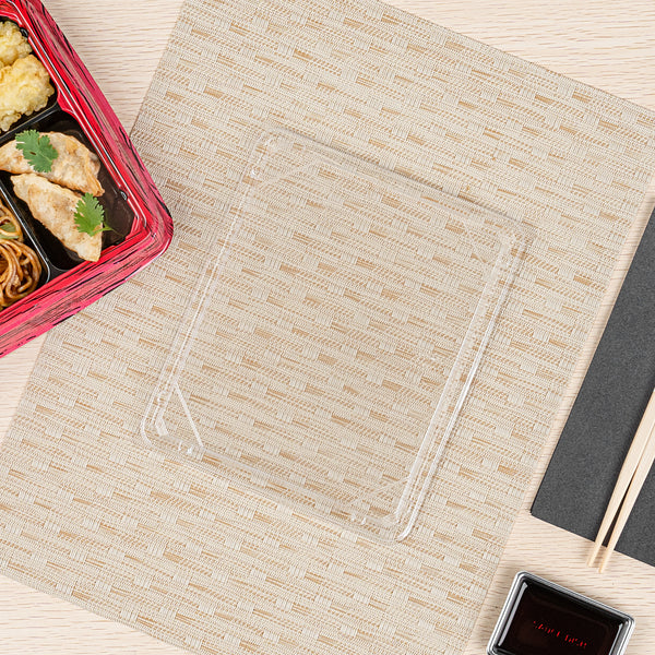 Effortlessly make meals portable for your customers with our Bento Tek Rectangle Clear Plastic Lids. These plastic lids perfectly fit onto compatible bento boxes (SKU: RWP1525B-50), making your meals instantly portable. Crafted from premium plastic, these lids for food containers are durable and sturdy, ensuring a reliable seal to keep food fresh and secure during transport. These clear lids are ideal for showcasing the vibrant colors of your catering presentations. For an effortless cleanup after serving, these food container lids are designed for single-use convenience. Ideal for eco-conscious foodservice establishments, these rectangle lids are recyclable, reducing your environmental impact. Measuring 8.5 inches in length by 7.25 inches in width by 0.75 inches in height, these container lids offer ample coverage. Sold in a 50 count box. Bento boxes are available and sold separately.