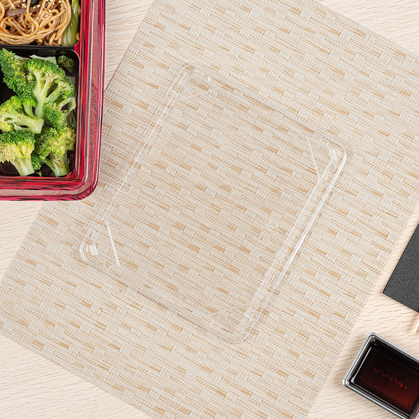 Protect your food in transit with our Bento Tek Rectangle Clear Plastic Lids. These plastic lids perfectly fit onto compatible bento boxes (SKU: RWP1531B-50), making your meals instantly portable. Crafted from premium plastic, these container lids are sturdy and durable, providing a reliable seal to keep your food fresh and secure during transport. The clear finish of these food container lids is great for showing off your catering presentations. For an effortless cleanup after serving, these clear lids are disposable. Ideal for eco-conscious foodservice establishments, these rectangle lids are recyclable. Measuring 8.5 inches in length by 7.25 inches in width by 0.75 inches in height, these lids for food containers fit a variety of food containers. Sold in a 50 count box. Bento boxes are available and sold separately.