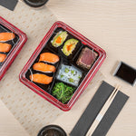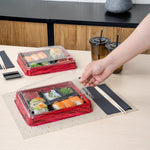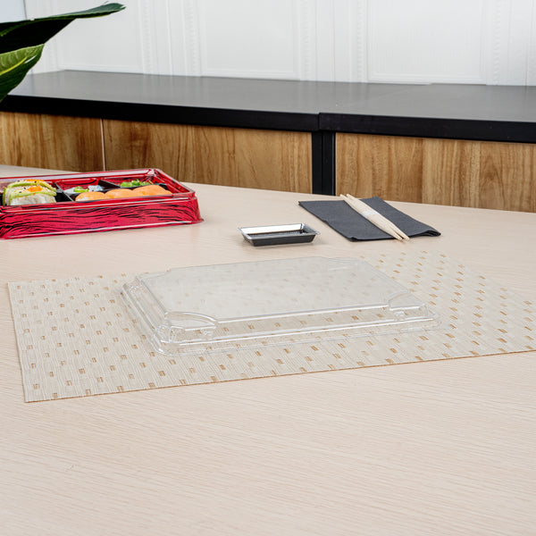 Elevate your food presentation with our Bento Tek Rectangle Clear Plastic Lids. These plastic lids perfectly fit onto compatible bento boxes (SKU: RWP1529B), making meals instantly portable for your customers. Crafted from premium plastic, these lids for food containers are durable and sturdy, providing a reliable seal to keep your food fresh and secure during transport. The clear finish of these container lids is great for showing off your exquisite food presentations. For an effortless cleanup after serving, these clear lids are disposable and can be discarded after use, minimizing the hassle. Ideal for eco-conscious foodservice establishments, these disposable lids are recyclable and help reduce your carbon footprint. Measuring 9 inches in length by 7.5 inches in width by 0.75 inches in height, these food container lids offer ample coverage for your dishes. Sold in a 100 count box. Bento boxes are available and sold separately.
