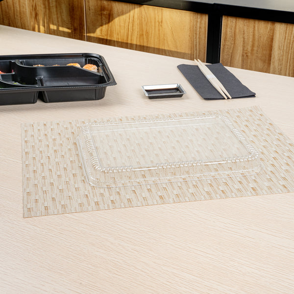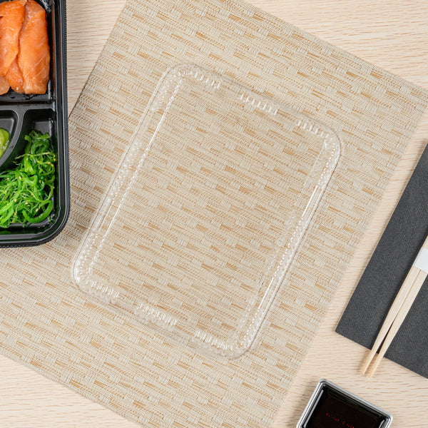 Seal your take out food’s freshness with our Bento Tek Rectangle Clear Plastic Lids. These plastic lids perfectly fit onto compatible bento boxes (SKU: RWP1521B) to make meals instantly portable for your customers. Crafted from premium plastic, these lids for food containers ensure a reliable seal to keep food fresh and secure during transport. The clear finish of these container lids is excellent for showcasing your catering presentations. Designed for effortless cleanup after serving, these food container lids are conveniently disposable and can be discarded after use. Ideal for eco-conscious foodservice establishments, these disposable lids help reduce your environmental footprint. Measuring 10 inches in length by 7.5 inches in width by 1 inches in height, these clear lids are perfect for a variety of food container sizes. Sold in a 100 count box. Bento boxes are available and sold separately.