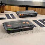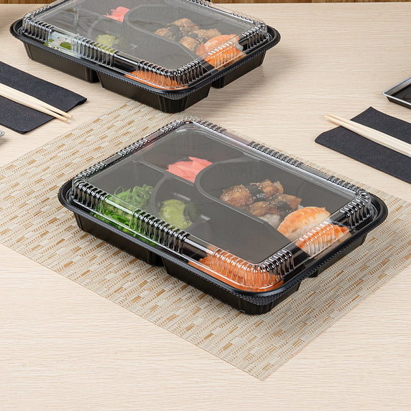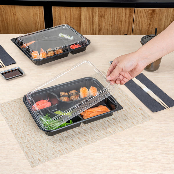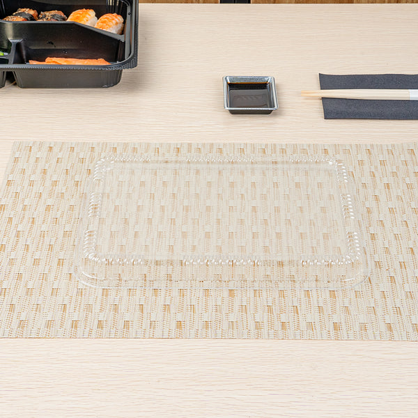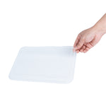 Seal your take out food’s freshness with our Bento Tek Rectangle Clear Plastic Lids. These plastic lids perfectly fit onto compatible bento boxes (SKU: RWP1521B-50) to make meals instantly portable for your customers. Crafted from premium plastic, these lids for food containers ensure a reliable seal to keep food fresh and secure during transport. The clear finish of these container lids is excellent for showcasing your catering presentations. Designed for effortless cleanup after serving, these food container lids are conveniently disposable and can be discarded after use. Ideal for eco-conscious foodservice establishments, these disposable lids help reduce your environmental footprint. Measuring 10 inches in length by 7.5 inches in width by 1 inches in height, these clear lids are perfect for a variety of food container sizes. Sold in a 50 count box. Bento boxes are available and sold separately.