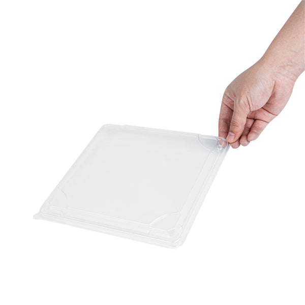 Elevate your food packaging with our Bento Tek Square Clear Plastic Lids. These plastic lids can be paired with their compatible bento boxes (SKU: RWP1537B), making meals instantly portable for your customers. Crafted from premium plastic, these durable lids for food containers create a reliable seal, ensuring your food stays fresh and secure during transport. The clear finish of these container lids is perfect for showcasing your catering presentations. For effortless cleanup after serving, these clear lids can be conveniently discarded. Ideal for eco-conscious foodservice establishments, these recyclable plastic lids help reduce environmental impact. Measuring 8.25 inches in length by 8.25 inches in width by 0.75 inches in height, these food container lids are tailored to meet your packaging needs. Sold in a 100 count box. Bento boxes are available and sold separately.