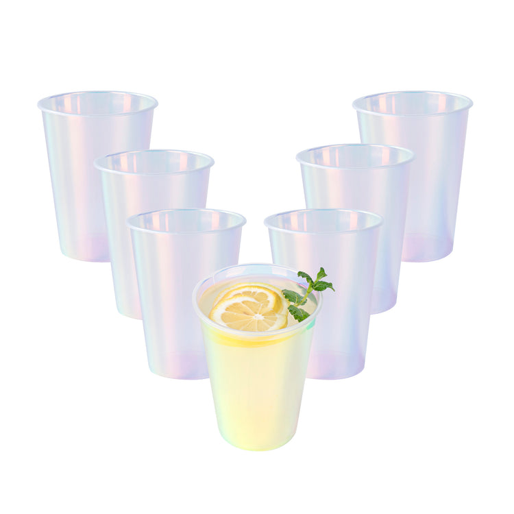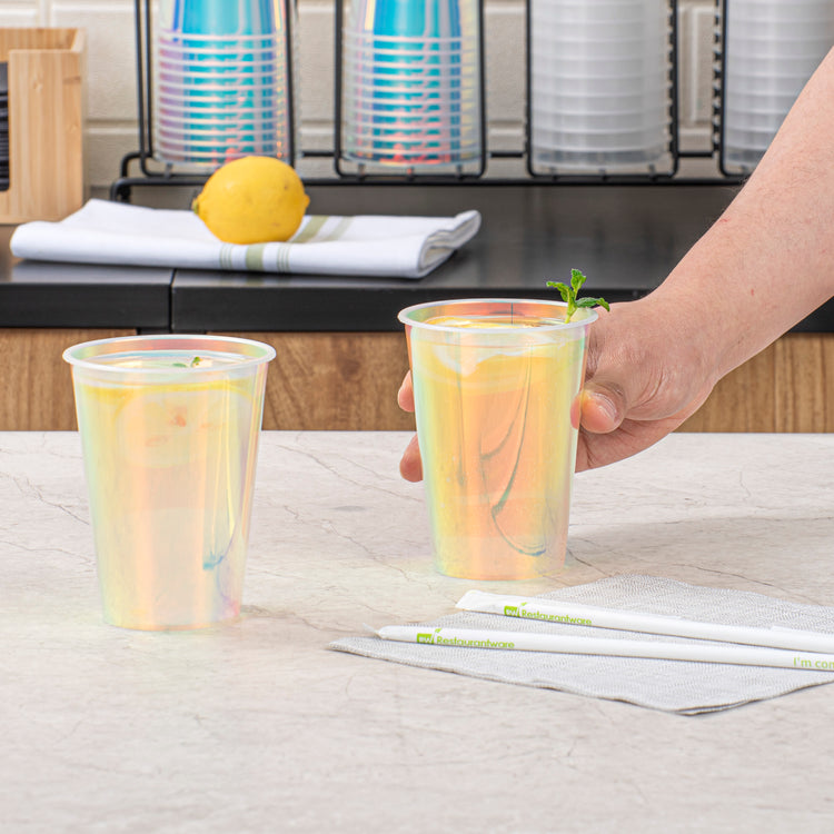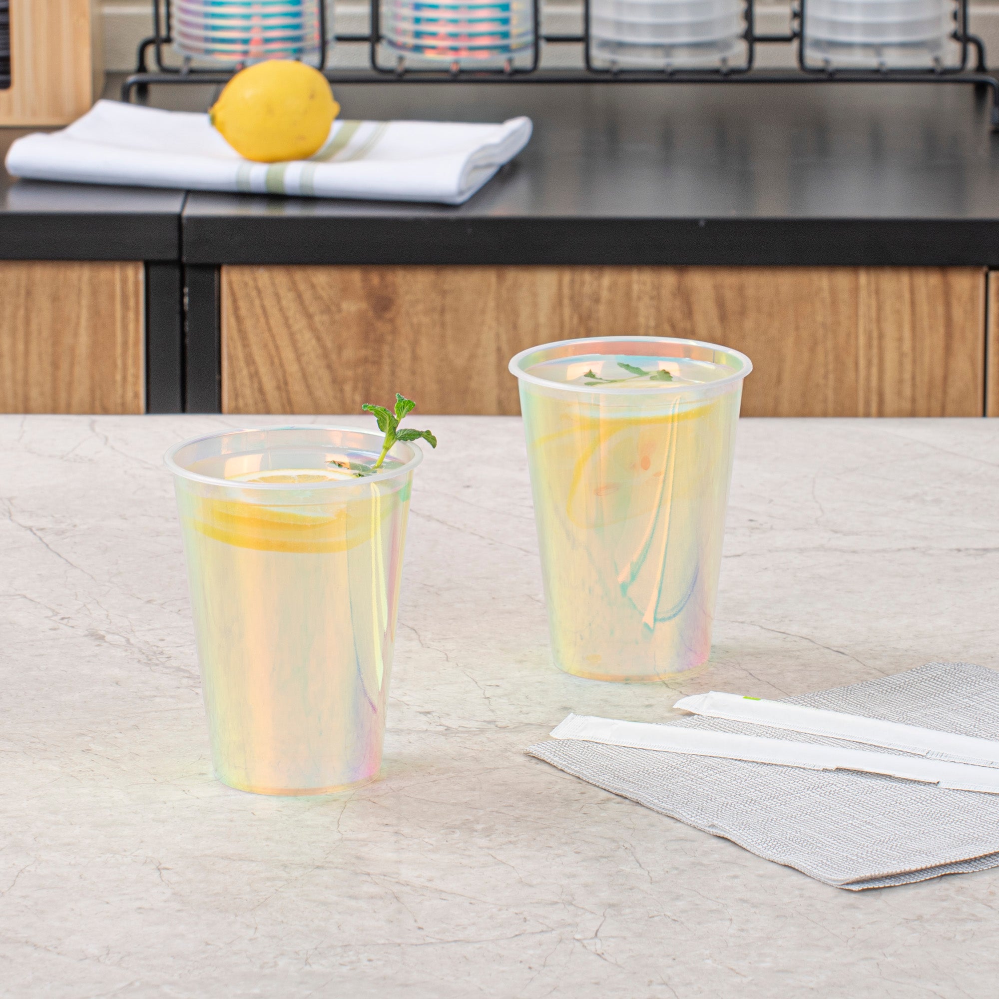 Captivate guests with vibrant, shimmering drinkware at your next event. Bev Tek Iridescent Finish Disposable Plastic Cups boast a stunning rainbow design that elevates beverage presentation, making them perfect as iridescent plastic cups for any occasion. With a 12.17-ounce capacity, these disposable party cups are ideal for serving a wide range of hot and cold drinks, allowing flexibility in menu offerings. Constructed from durable plastic, these cups withstand temperatures, ensuring safe use with hot beverages. Their stackable design maximizes space efficiency in busy kitchens, streamlining operations by reducing clutter. Enhance your service efficiency with these versatile disposable plastic cups, designed to simplify cleanup and inventory management. Each order includes 500 Bev Tek Iridescent Finish Disposable Plastic Cups.