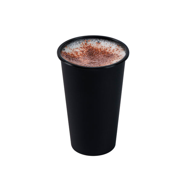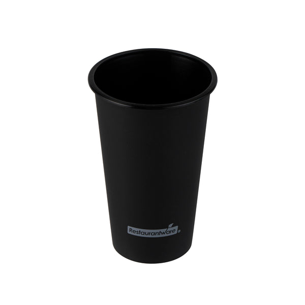 Enjoy cold brews or steamy lattes using our Bev Tek 16-ounce Round Matte Black Plastic Hot and Cold Drinking Cups. Made from BPA-free plastic, these reusable drinking cups are durable yet flexible, for a secure grip on cups. These black plastic cups are perfect for serving hot and cold drinks from 14F to 248F and are microwave-safe. Featuring a sleek matte black finish and a rolled rim, these black plastic cups provide a stylish and comfortable way to sip on drinks. Take your favorite drinks on the go by pairing these plastic drinking cups with their matching lids (SKU: RWP0558 and RWP0559). Ideal for space-saving storage, the tapered design makes these reusable drinking cups easily stackable. These recyclable cups are disposable but can also be reused by simply washing them on the top rack of your dishwasher. Made to hold up to 16 ounces, these black drinking cups measure 3.5 inches diameter by 5.25 inches in height. Available in a 100 count box. Lids are available and sold separately. We recommend using a sleeve when serving hot beverages.