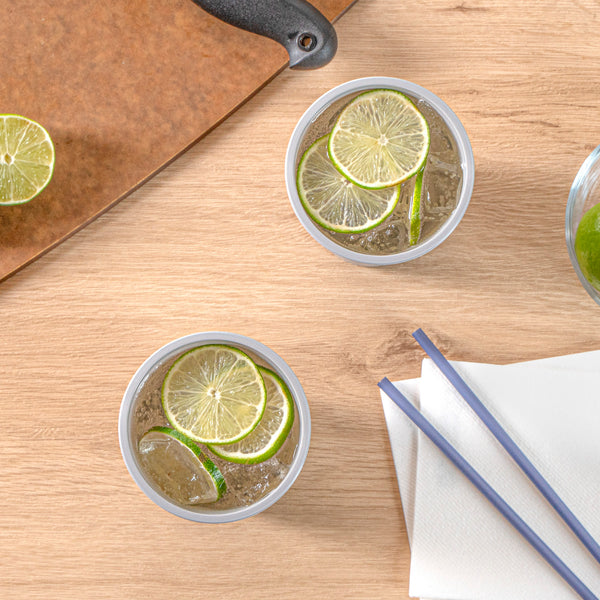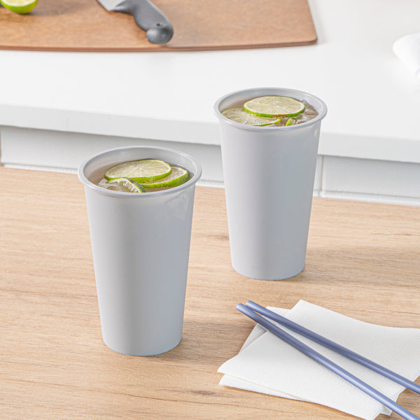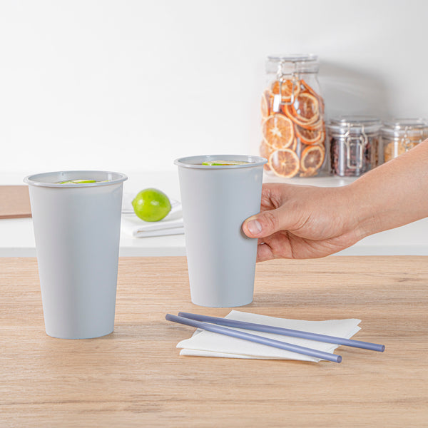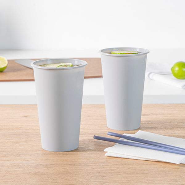Serve hot or cold beverages with our Bev Tek 16-ounce Round Matte Gray Plastic Hot / Cold Drinking Cups. Featuring a matte gray finish, these gray plastic cups effortlessly add a classic charm to your beverage presentation and establishment's decor. Crafted from premium plastic, these recyclable coffee cups are conveniently disposable and top rack dishwasher safe for quick and easy cleanup at your catering event, restaurant, bakery, or other foodservice establishment. These 16-ounce plastic cups have a rolled rim to allow your customers to comfortably sip their coffee, lemonade, tea, and other hot or cold drinks. Pair your tasty beverages with our compatible lids (SKU: RWP0558 and SKU: RWP0559) to prevent spills during delivery services. Built to contain temperatures between 14F and 248F, these disposable coffee cups can serve hot drinks with sleeves or cool, refreshing drinks. Containing up to 16 ounces, these microwave-safe cups measure 3.5 inches in diameter by 5.25 inches in height and are shipped in a 100 count box.