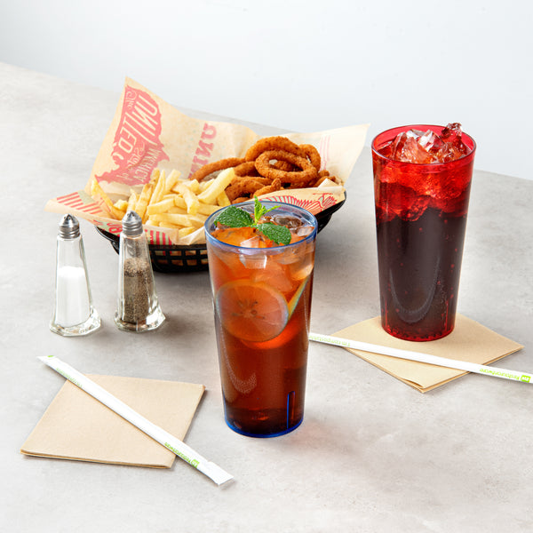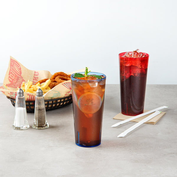 Enhance your beverage service with style and durability. The Bev Tek Blue Plastic Tumbler features a distinctive pebbled finish that provides a textured look, elevating your drink presentation. Constructed from durable SAN plastic, this plastic tumbler is designed to withstand the demands of daily use, minimizing breakage and ensuring long-lasting service in any foodservice environment. Its dishwasher-safe design facilitates easy and efficient cleaning, saving valuable time and labor costs. With a generous 24-ounce capacity, this drinking glass is ideal for serving cocktails, sodas, or iced beverages, catering to a wide range of customer preferences. Measuring 3.5 inches in width and 7 inches in height, this 24 oz tumbler fits comfortably in hand while complementing any table setting. Choose this dependable and attractive option for your drinkware needs and see the difference in customer satisfaction. Each order includes 50 Bev Tek Blue Plastic Tumblers.
