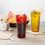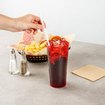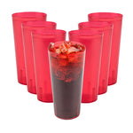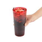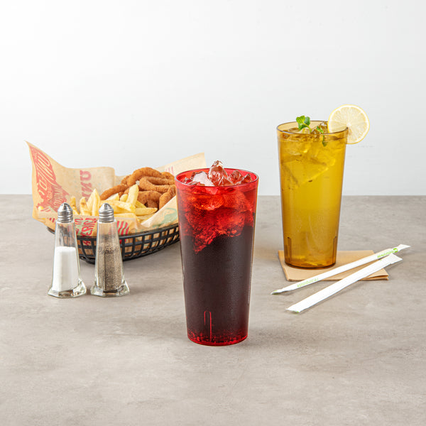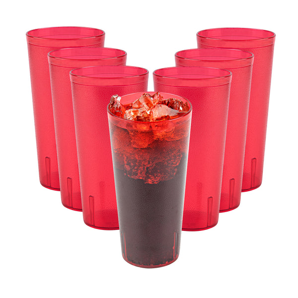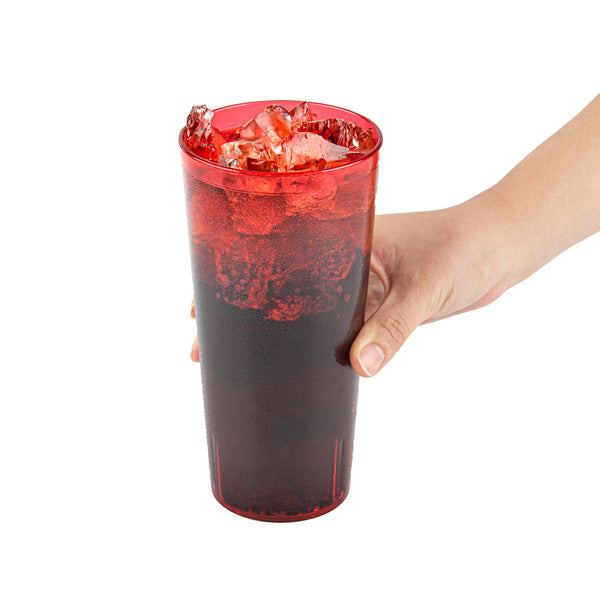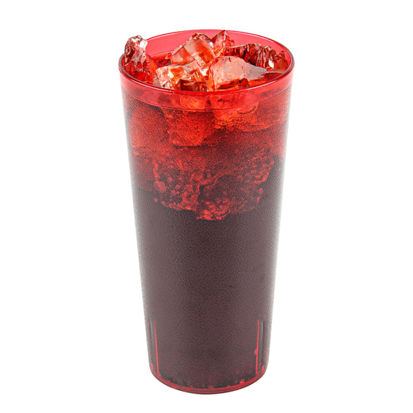 Enhance your drink presentation with vibrant, reliable glassware. The Bev Tek Pebbled Plastic Drinking Glass combines an eye-catching pebbled finish with a sturdy construction, creating a reusable plastic glass that elevates the look of any beverage service. Designed with the fast-paced demands of foodservice in mind, the dishwasher-safe feature ensures easy and efficient cleaning, allowing you to maintain a pristine appearance with minimal effort. Crafted from SAN plastic, this durable plastic tumbler withstands daily use, minimizing breakage and ensuring long-term performance in commercial settings. With a generous 24-ounce capacity, these glasses are ideal for serving a variety of cold drinks, making them a versatile addition to any bar or restaurant. Enhance your establishment's efficiency and presentation with these red, 3.5-inch by 7-inch glasses, perfect for a range of cold beverages. Each order includes 10 Bev Tek Pebbled Plastic Drinking Glasses.