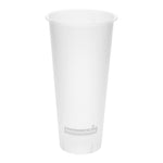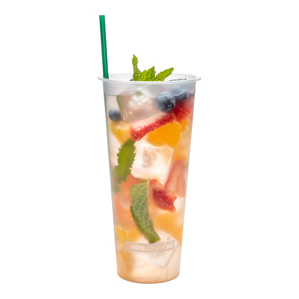 Serve flavorful hot or cold beverages with our Bev Tek 24-ounce Round Frosted Clear Plastic Hot / Cold Drinking Cups. Featuring a clear finish and frosted exterior, these large plastic cups effortlessly bring a modern look that fits perfectly with the interior decor at your cafeteria, coffee shop, restaurant, or other foodservice establishment. Built from high-quality plastic, these recyclable drinking cups are conveniently disposable and can be placed on the top rack of your dishwasher for easy cleanup after any event. These 24-ounce clear cups have a sturdy, rolled rim to allow your staff to pair cups with our compatible lids (SKU: RWP0558 and SKU: RWP0559) for delivery. These disposable coffee cups can contain liquids between 14F and 248F, which makes them great for serving hot drinks with sleeves or cold drinks such as lemonade or iced tea. Measuring 3.5 inches in diameter by 7 inches in height, these microwave-safe plastic cups can contain up to 24 ounces of juice, coffee, lemonade, and other tasty drinks. Shipped in a 100 count box.